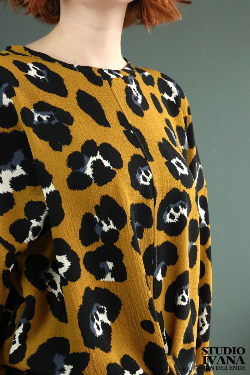 De heeft een ronde hals en lange mouwen met plooien. De hals en de mouwen zijn afgewerkt met een boordje in dezelfde stof.
