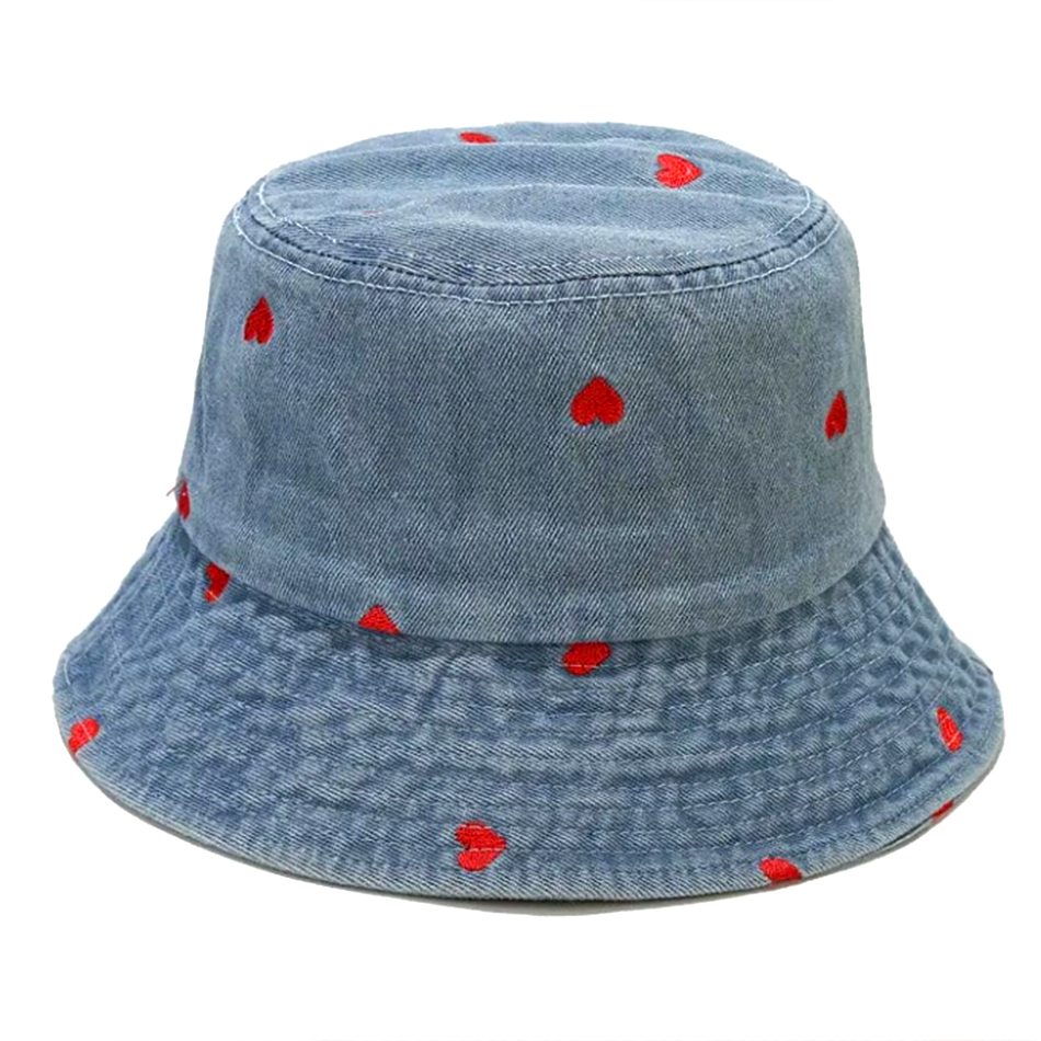 De subtiele denimblauwe kleur wordt speels onderbroken door geborduurde rode hartjes, wat het hoedje een romantische en unieke uitstraling geeft.