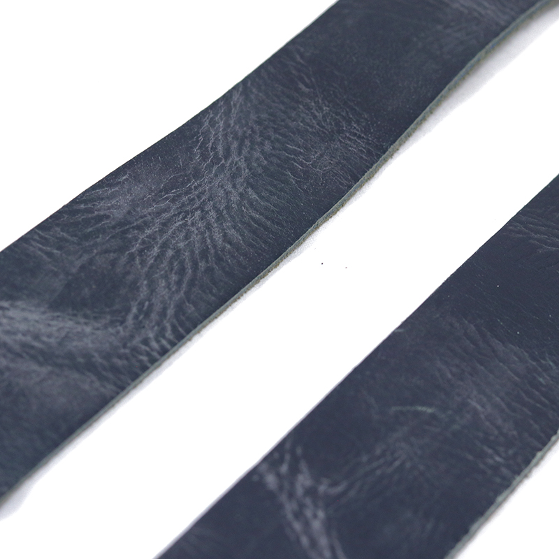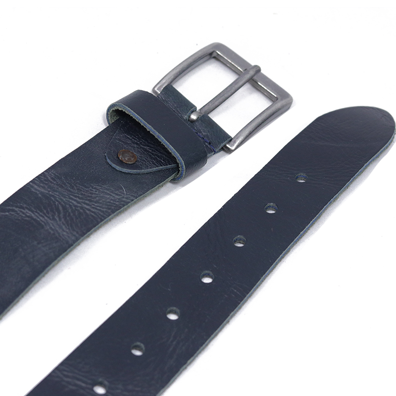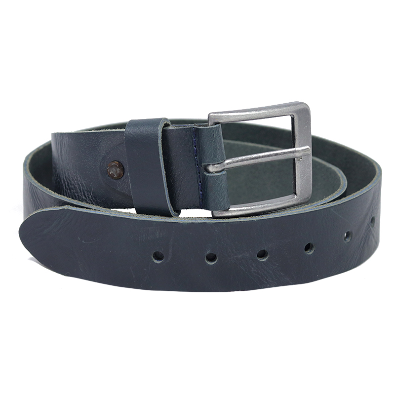Donkerblauwe herenriem van bewerkt leder. Mooie basic en stevige broekriem met zilverkleurige gesp.