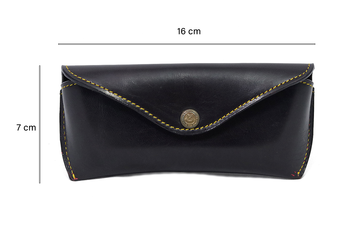 Je sluit de brillenhoes af met de metalen drukknoop aan de voorkant.