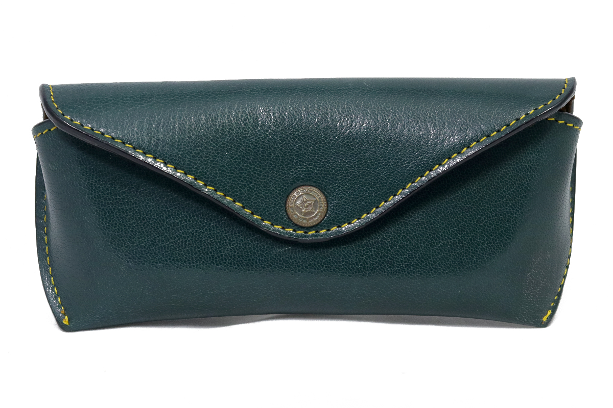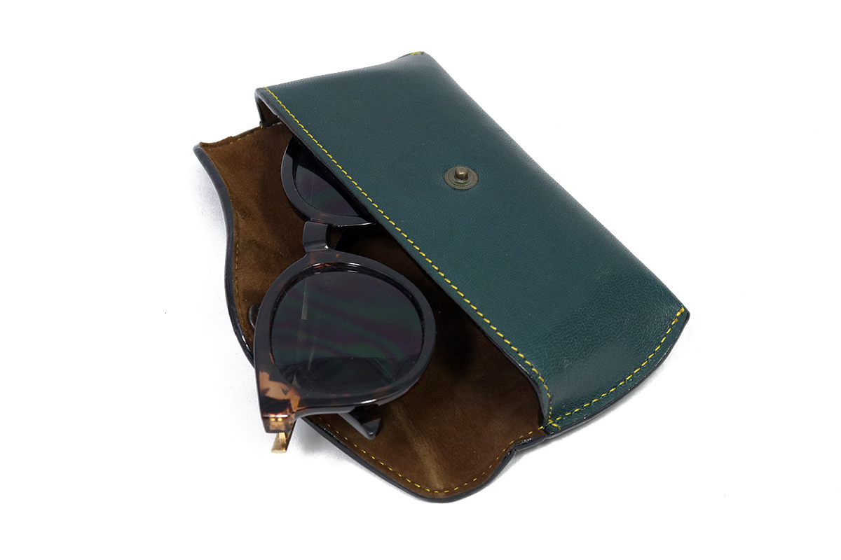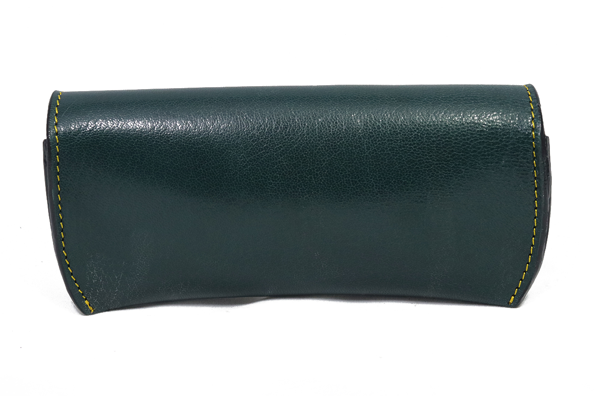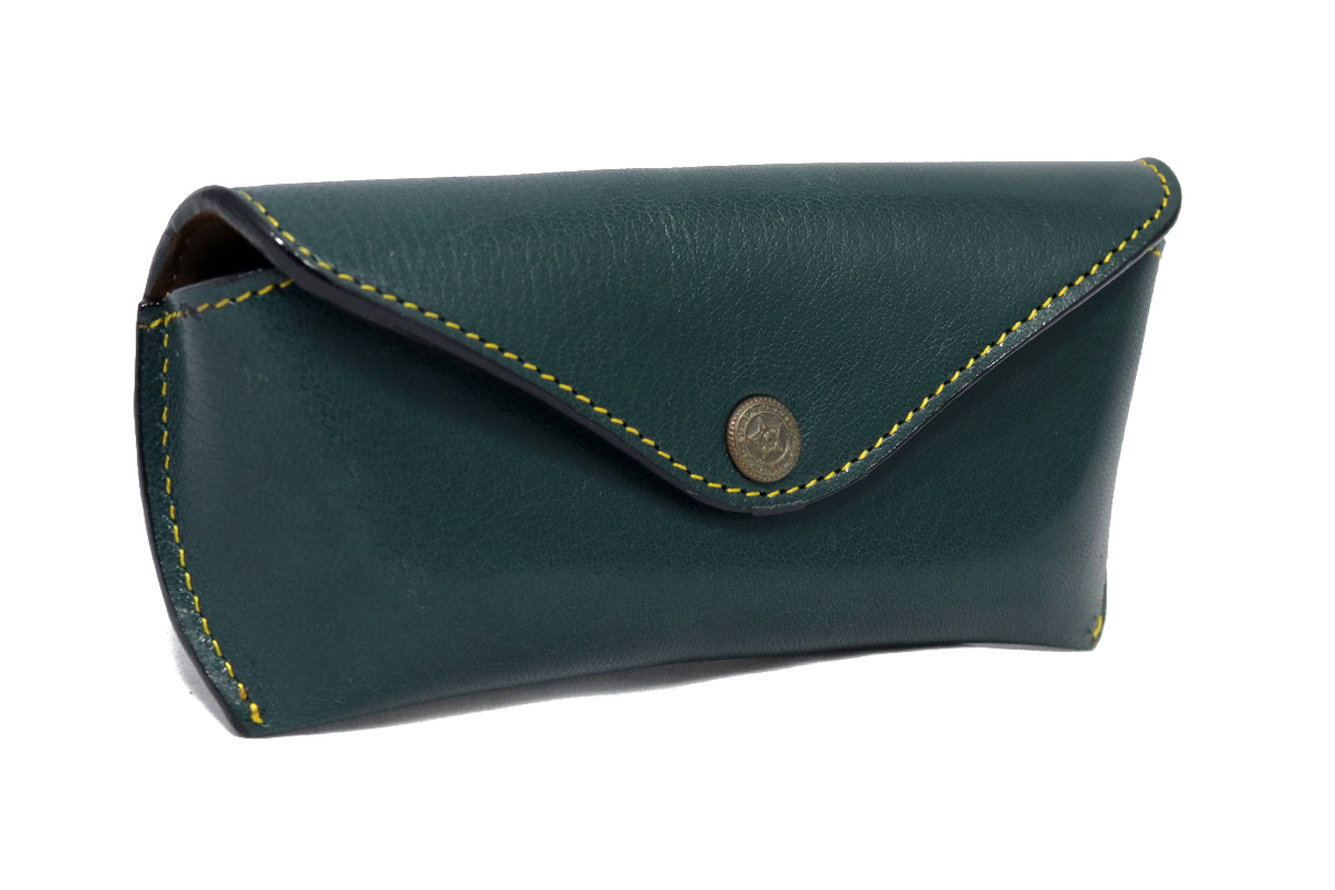 Donkergroene brillenhoes met drukknoop, van effen leder.