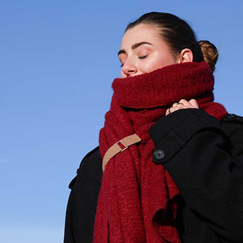 Deze donkerrode sjaal en omslagdoek met lus heeft zicht al meerdere jaren bewezen als echte must-have voor de frissere seizoenen. De handige lus zorgt ervoor dat de sjaal goed blijf zitten.