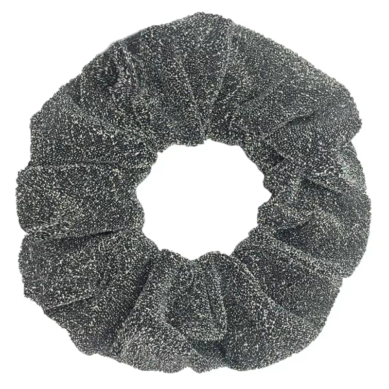 Donkerzilveren glitter scrunchie, gemaakt van textiel met een lurex draad. Met deze feestelijke haarwokkel ben jij party-proof! De glitters zijn in de stof verweven en laten dus niet los.