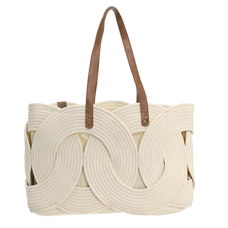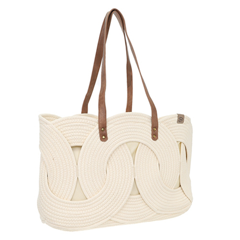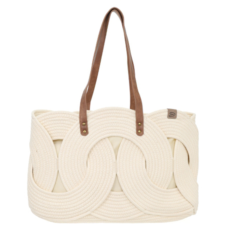 De ecru strandtas Bionda heeft een uniek design door het opvallende en stoere vlechtwerk. De grote zomerse tas heeft een stevige buitenkant van katoen en een voering binnenin. De schouderbanden zijn gemaakt van imitatieleder. De strandtas is af te sluiten met een handige rits en binnenin heb je veel praktische opbergruimte. In de voering vind je nog een steekvakje.