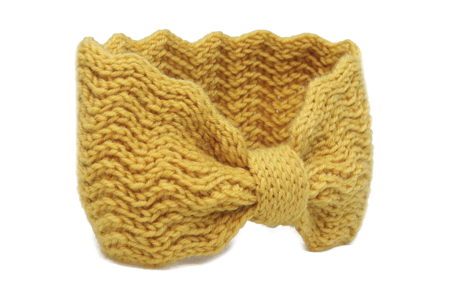 Een leuke gele gebreide haarband met strik! De band is breed genoeg om de oren geheel te bedekken en rekt lekker mee. Gemaakt van zachte, maar stevige acryl.