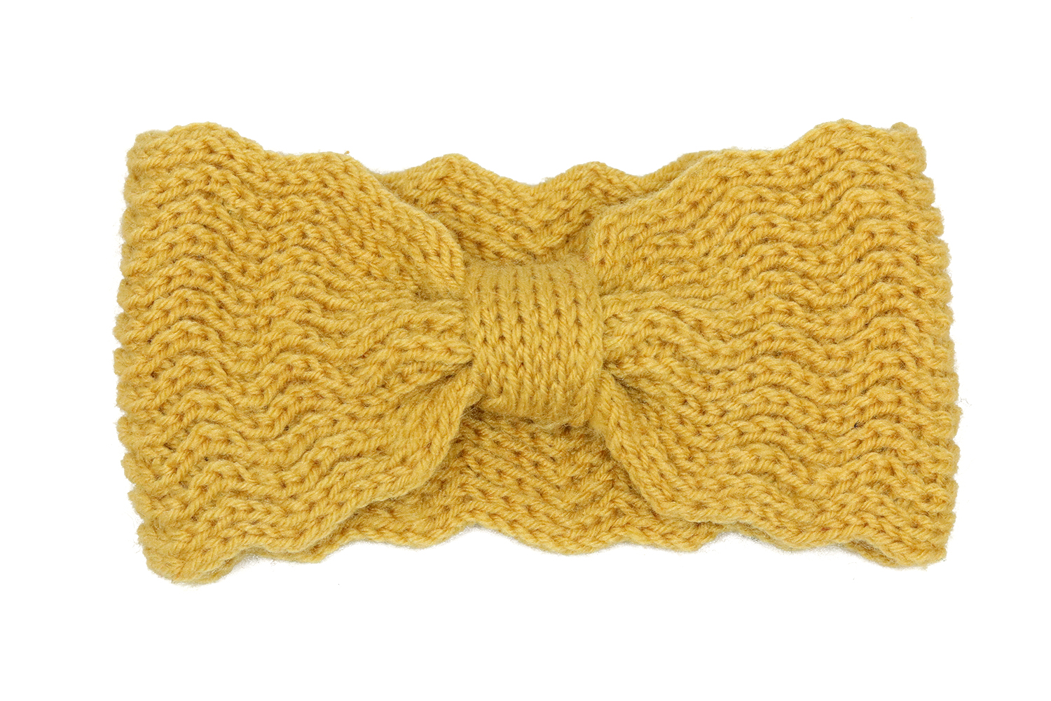 Een leuke gele gebreide haarband met strik! De brede hoofdband houd je hoofd en oren warm en heeft aan de voorkant een leuk detail, namelijk de strik.