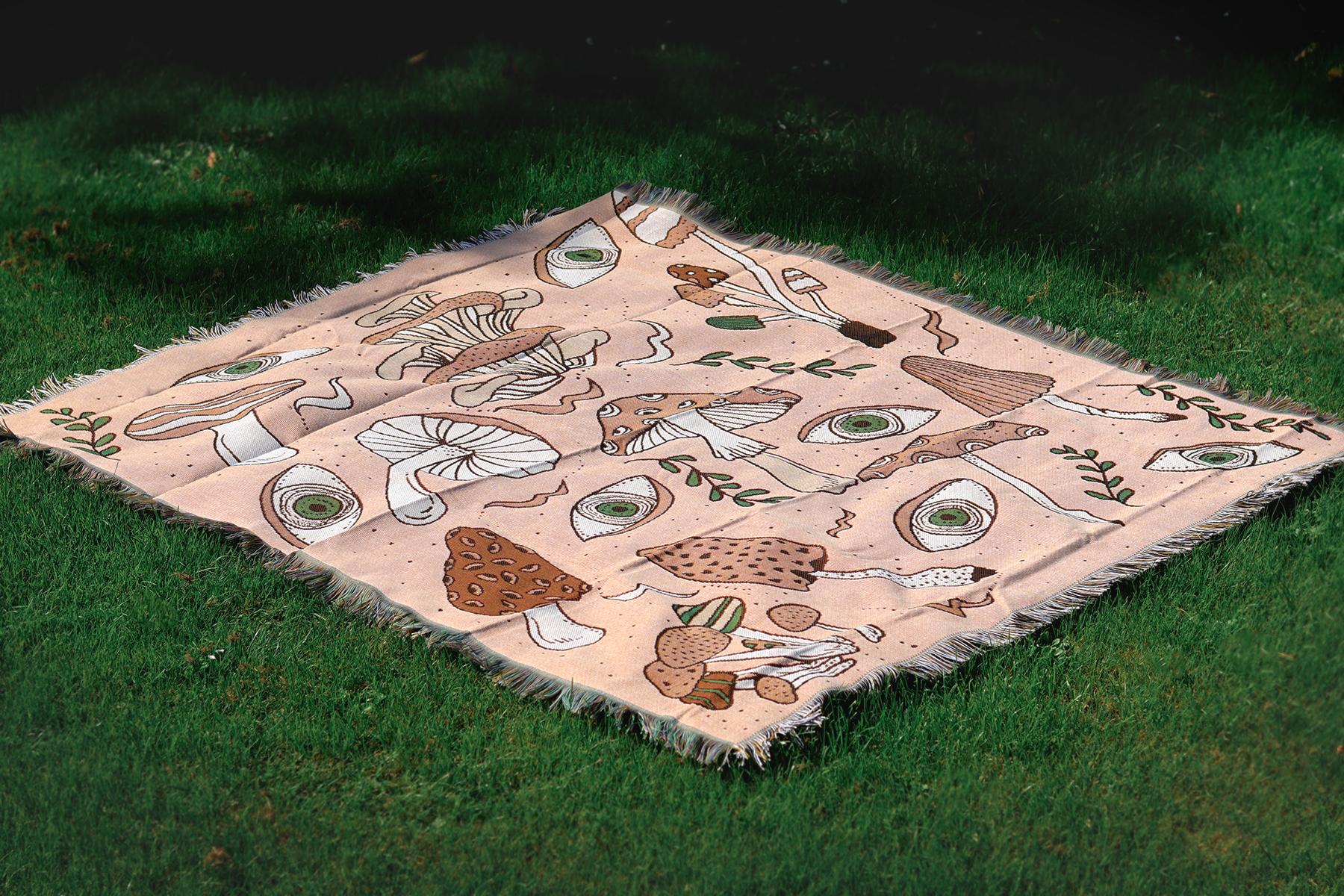 Dit geweven kleed met paddenstoelen is gemaakt van katoen en polyester mix. De print is ingeweven en aan 1 zijde te bewonderen in de prachtige kleuren.