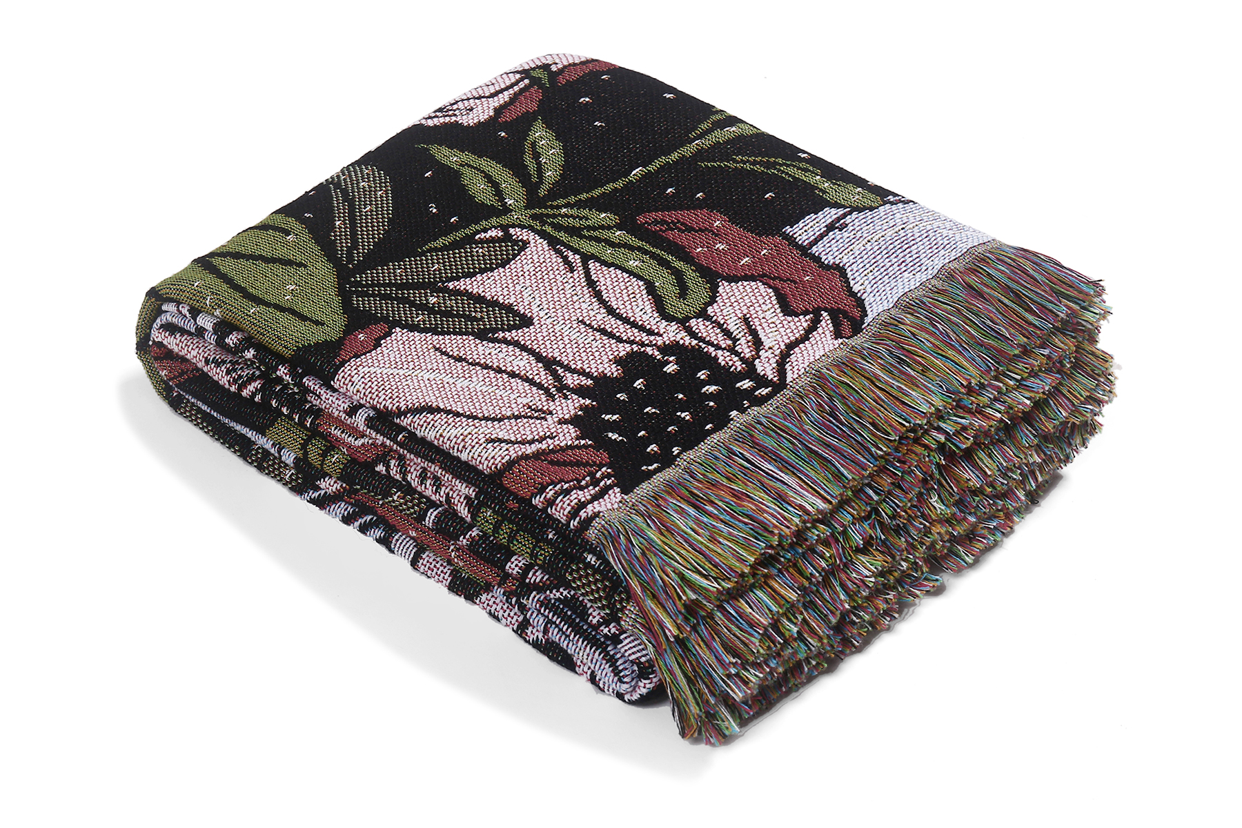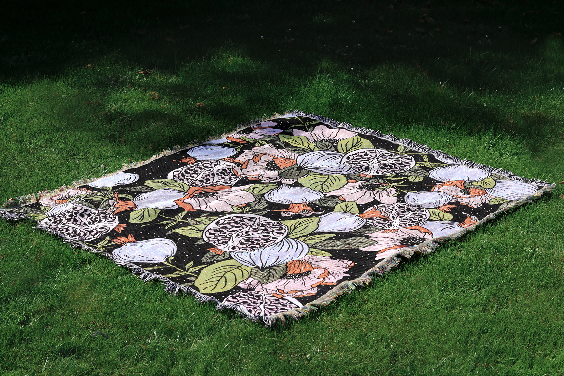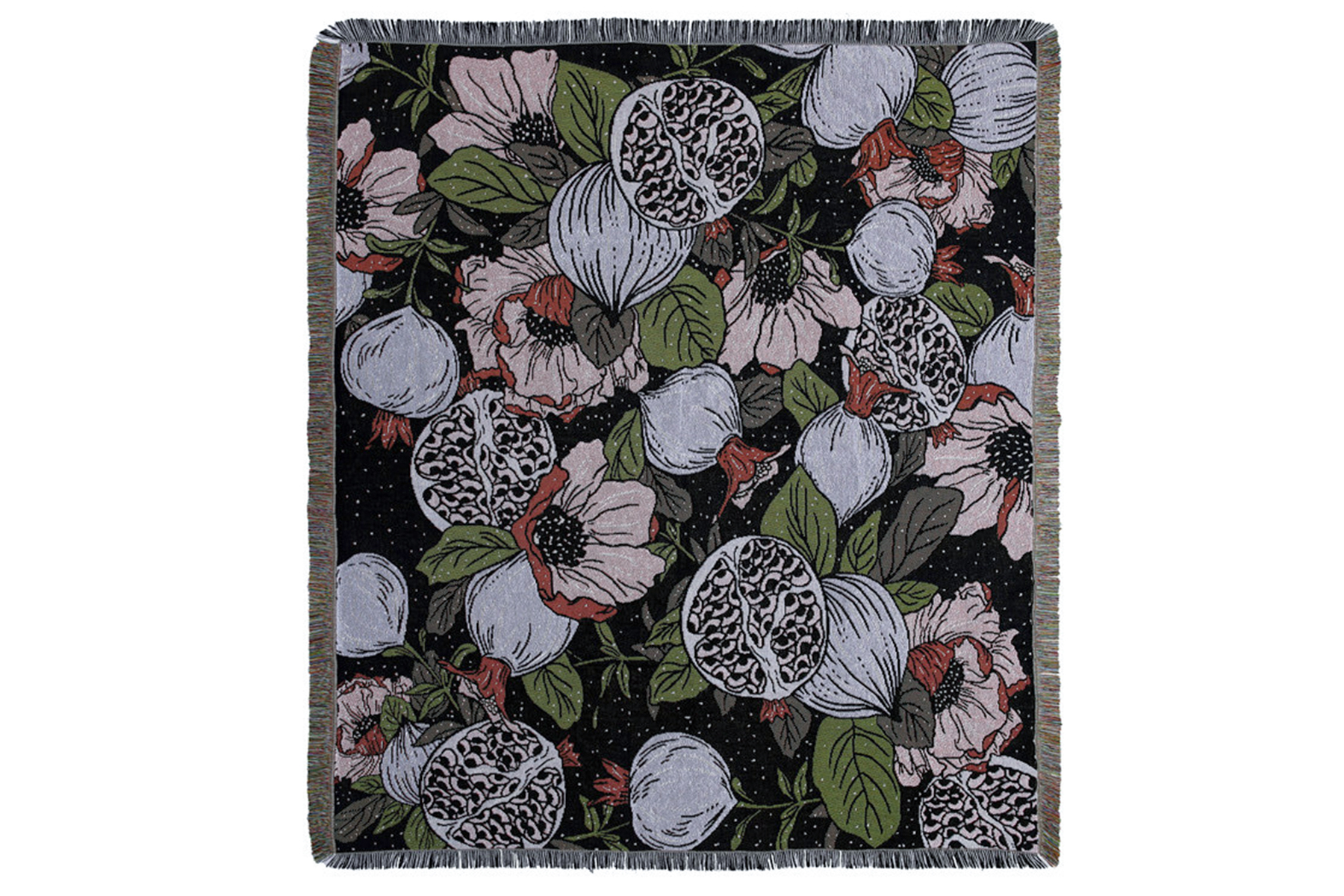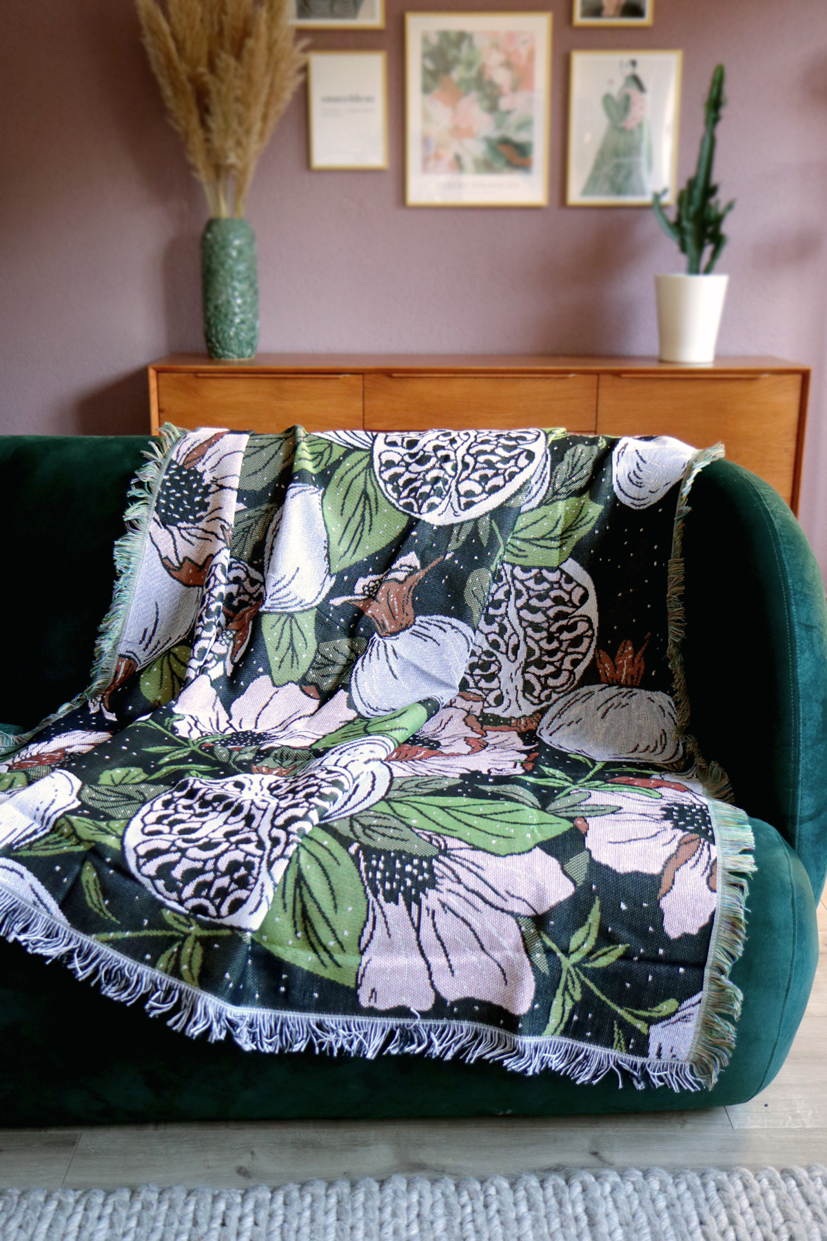 Dit geweven kleed met granaatappels en bloemen is gemaakt van katoen en polyester mix. De print is ingeweven en aan 1 zijde te bewonderen in de prachtige kleuren.