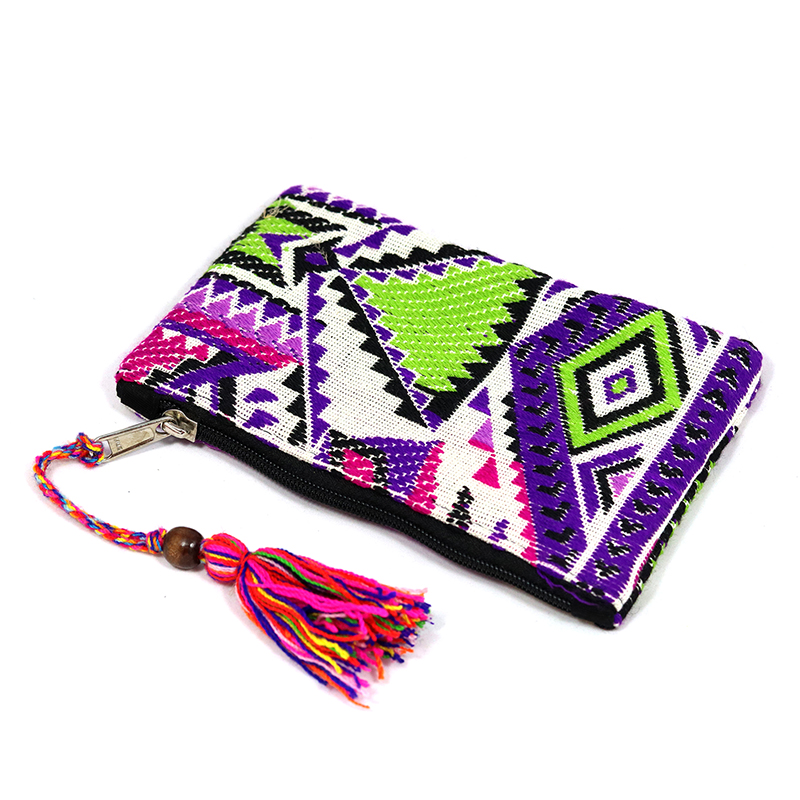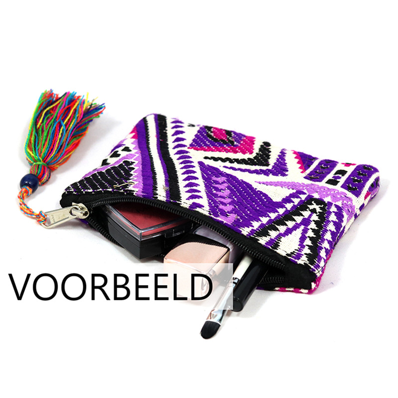De geweven etui heeft een ritssluiting aan de bovenzijde met daaraan een gekleurd, katoenen kwastje. Het tasje is aan de binnenkant gevoerd met een zwarte stof.