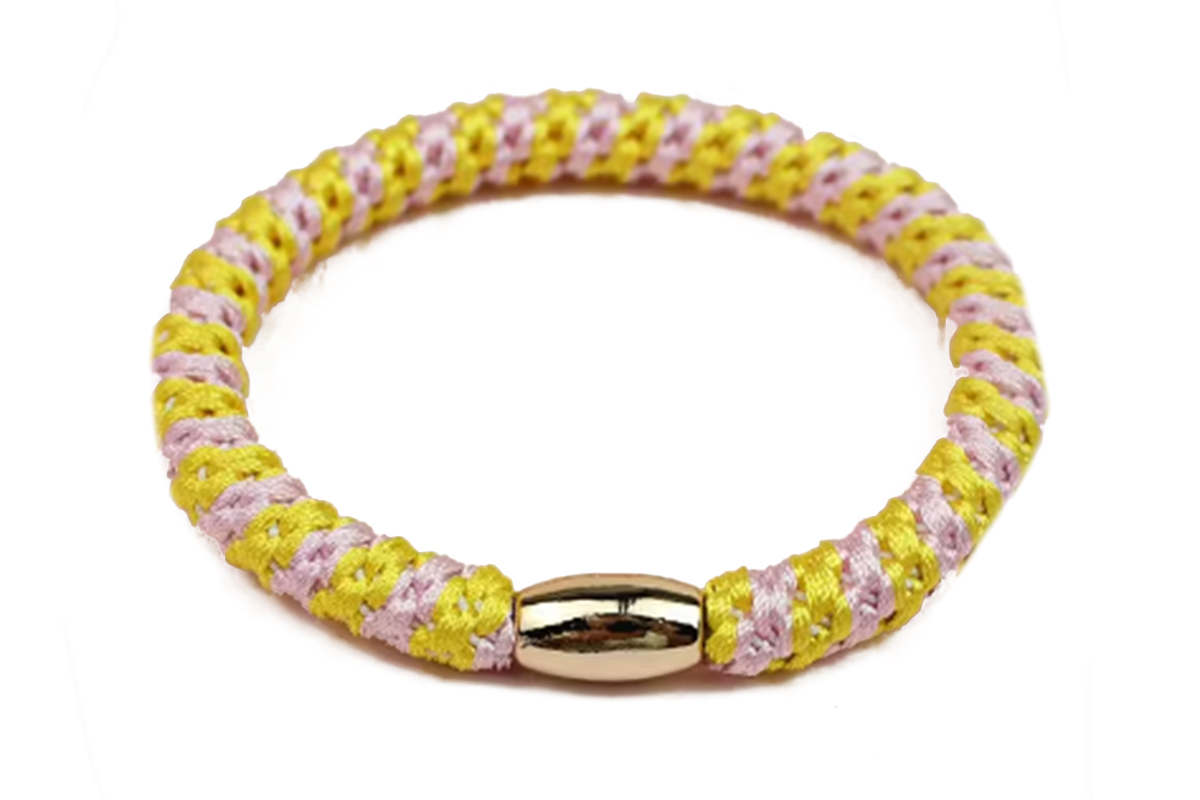 Haarelastiek gestreept in lichtroze en geel. Leuk elastisch bandje voor in je haar of om je pols. Het is gestreept in twee kleuren en heeft een gouden sluiting.