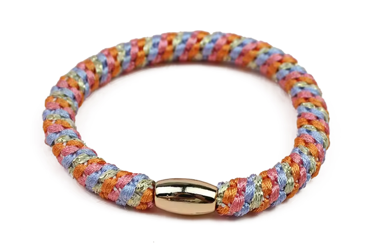 Haarelastiek glitter in regenboog kleuren. Leuk glimmend elastisch bandje voor in je haar of om je pols. Het heeft een subtiel glittertje en een gouden sluiting.