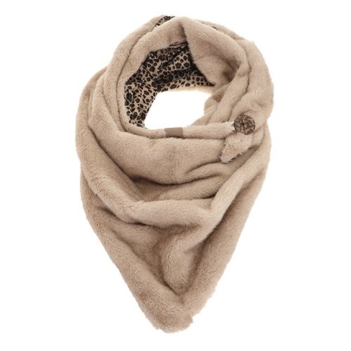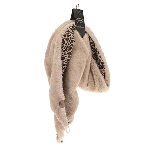Khaki faux fur omslagdoek en sjaal is een accessoire, gecreëerd om elke outfit direct karakter te geven. Deze driehoekige sjaal is gemaakt met 2 stoffen: de ene zijde is heerlijk zacht en aaibaar, terwijl de andere kant een soepele, matte finish heeft met animalprint.