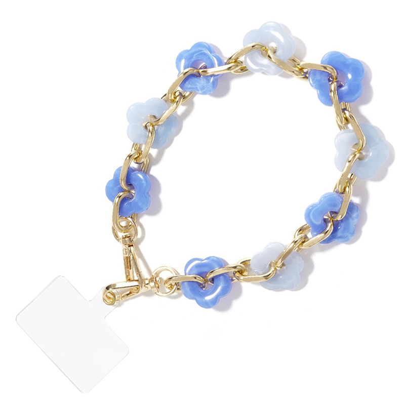 Kort telefoonkoord Flora is gemaakt met blauwe acryl kralen in de vorm van een bloem, afgewisseld met gouden schakels. De ketting met opvallende kralen is een sieraad voor je telefoon!
