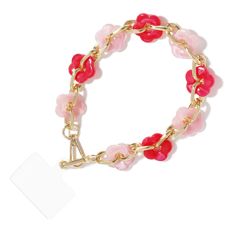 Kort telefoonkoord Flora is gemaakt met rood en roze acryl kralen in de vorm van een bloem, afgewisseld met gouden schakels. De ketting met opvallende kralen is een sieraad voor je telefoon!