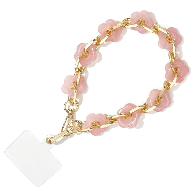 Kort telefoonkoord Flora is gemaakt met roze acryl kralen in de vorm van een bloem, afgewisseld met gouden schakels. De ketting met opvallende kralen is een sieraad voor je telefoon!