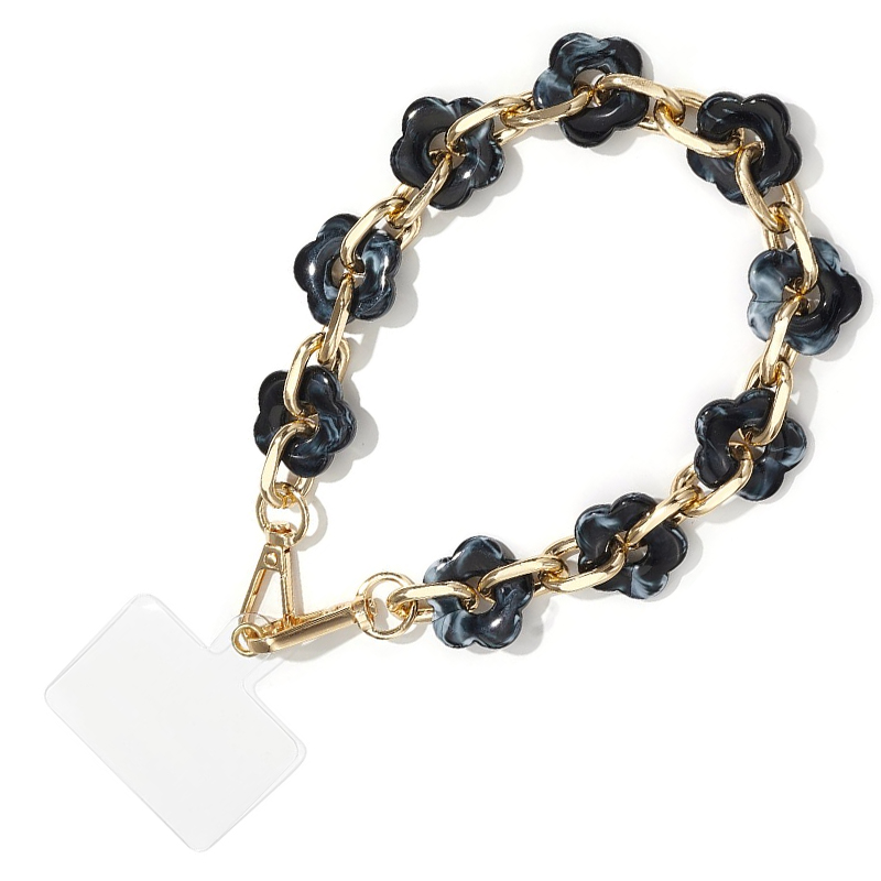 Kort telefoonkoord Flora is gemaakt van zwarte acryl kralen in de vorm van een bloem. Afgewisseld met gouden schakels. Niet in lengte verstelbaar. Met universele bevestiging.