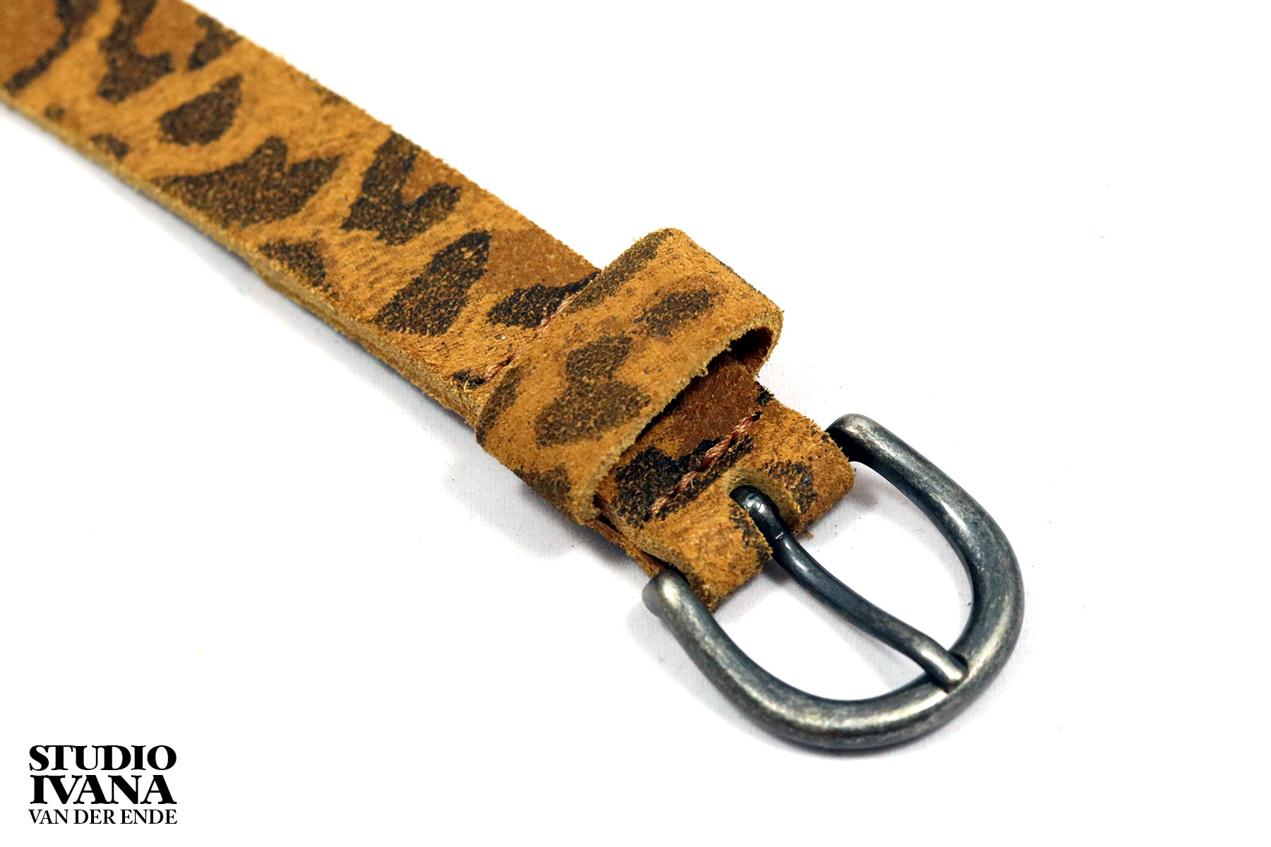 Een leuk en subtiel riempje met dierenprint over de gehele lengte. Aan het einde een oud zilverkleurige gesp van metaal.