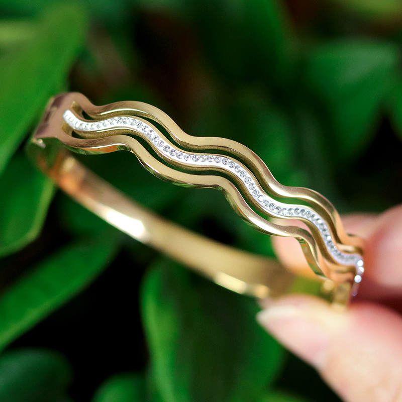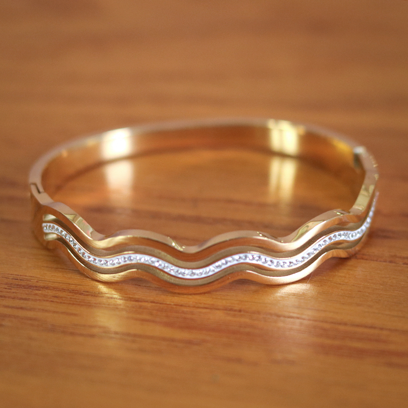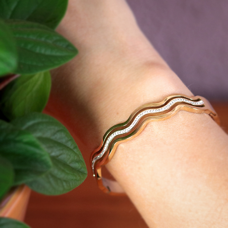 Daarmee gaat de armband soepel open en dicht. De golvende vorm + steentjes is zichtbaar aan 1 kant. De andere kant van de armband is glad.