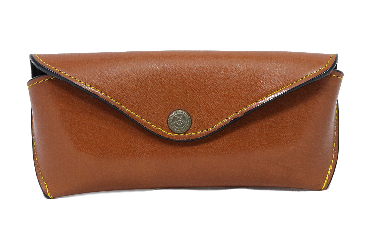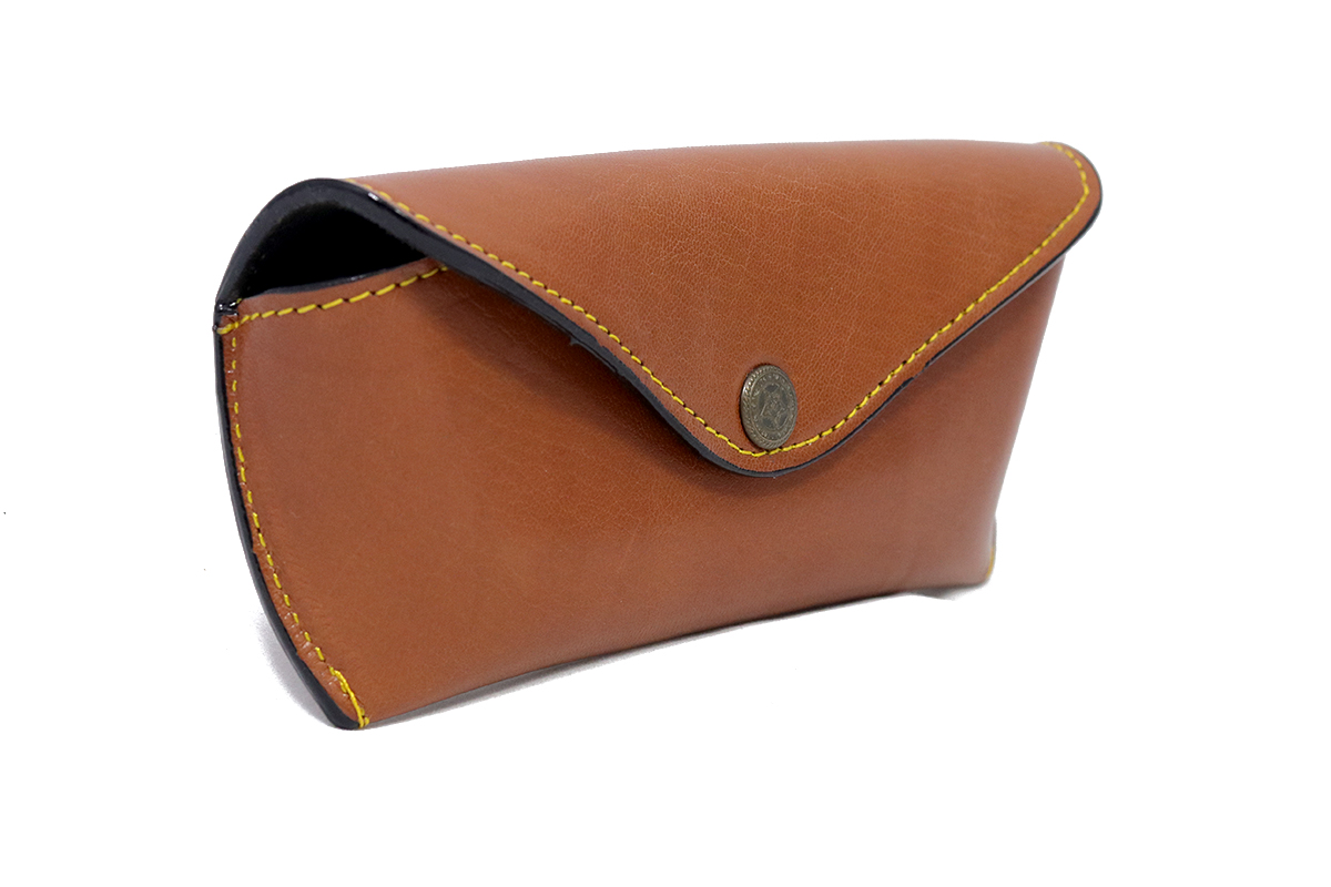 Middenbruine brillenhoes met drukknoop, van effen leder.