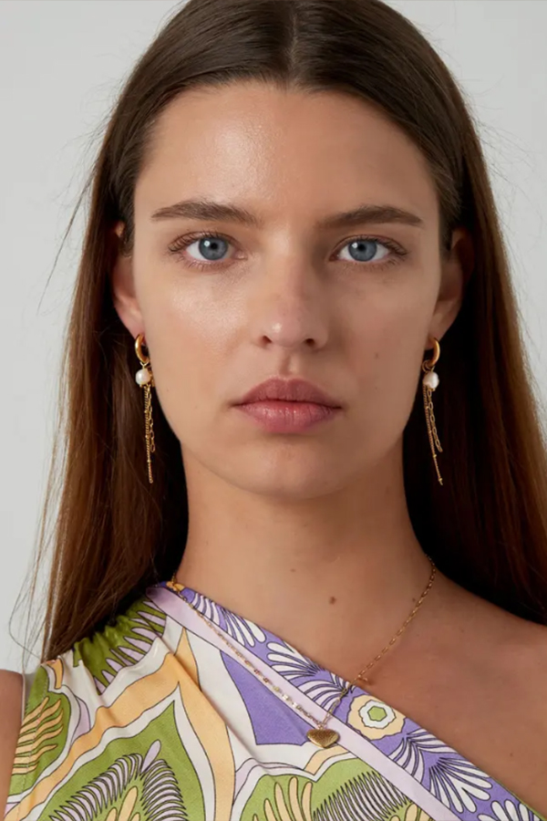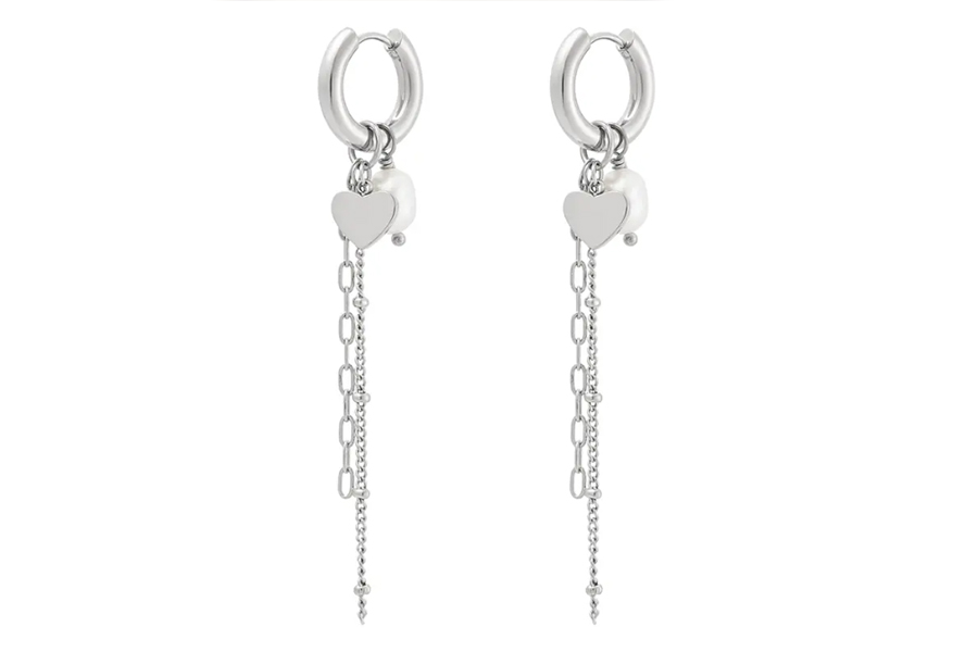 Hoe leuk zijn deze zilveren oorbellen met ketting, parel en hartje! Mooi bij een chique outfit, maar ook gewoon casual. De oorbel heeft een totale lengte van 7 cm en is gemaakt van stainless steel.