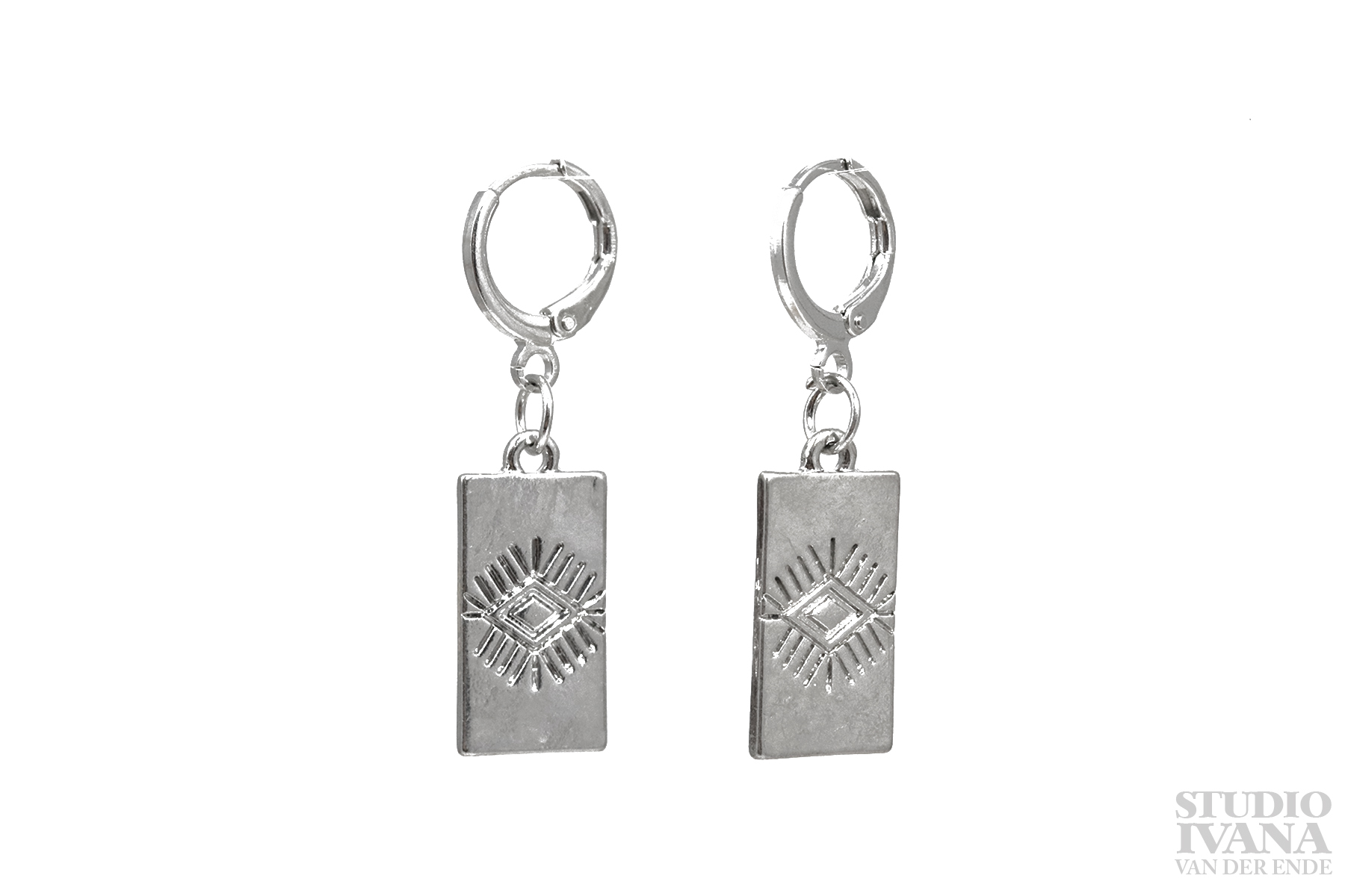 De hanger is een plat, zilverkleurig plaatje met een ingegraveerd oog.