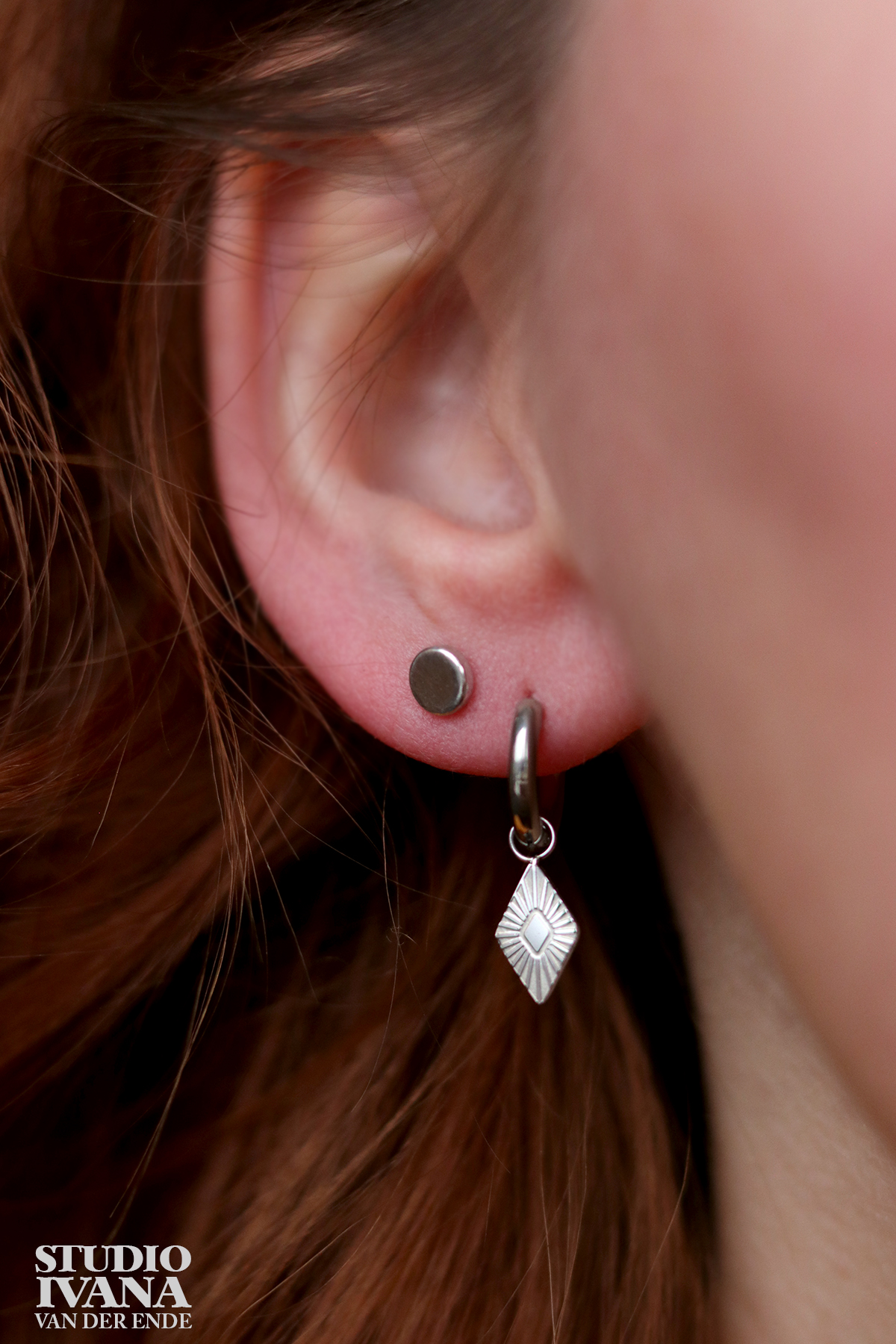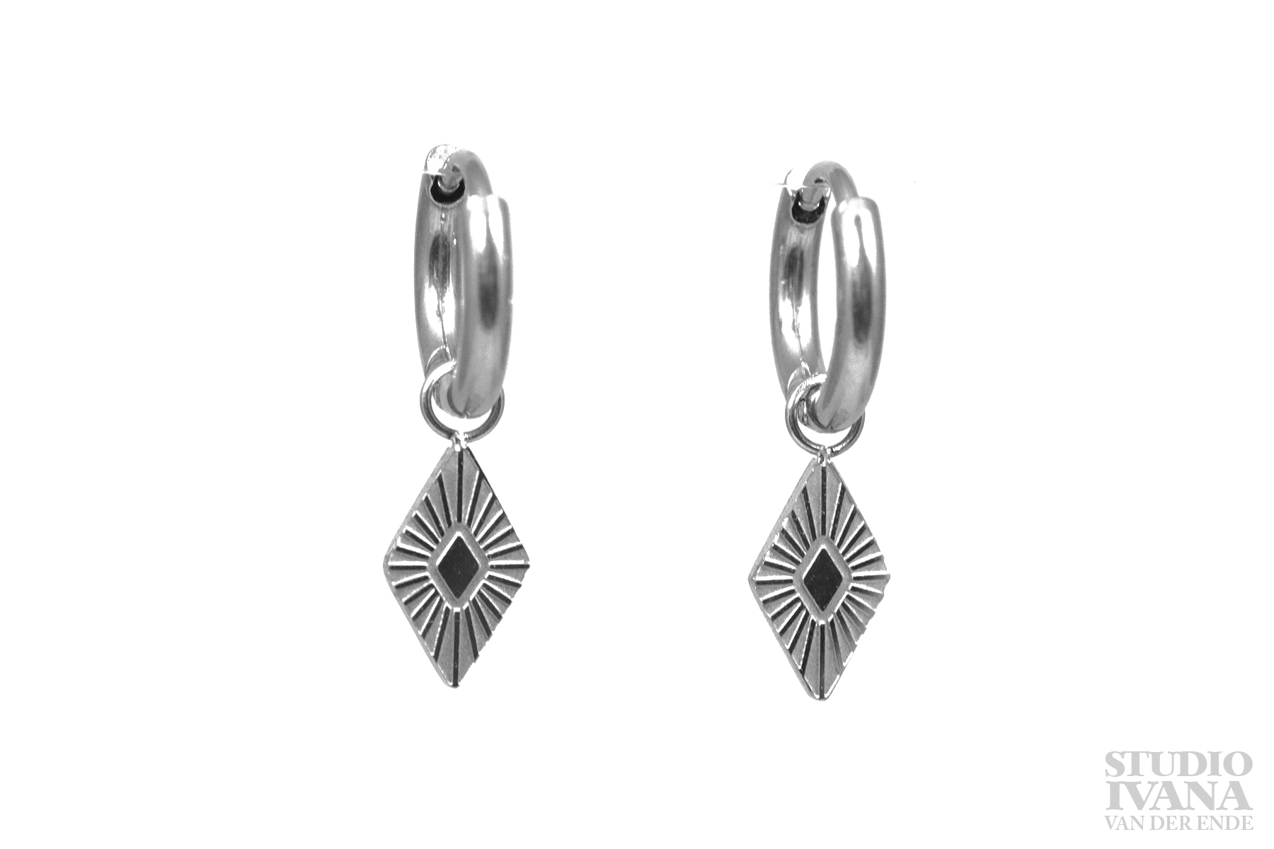 De oorring Ruit is een zilverkleurig oorbelletje met hanger van staal.