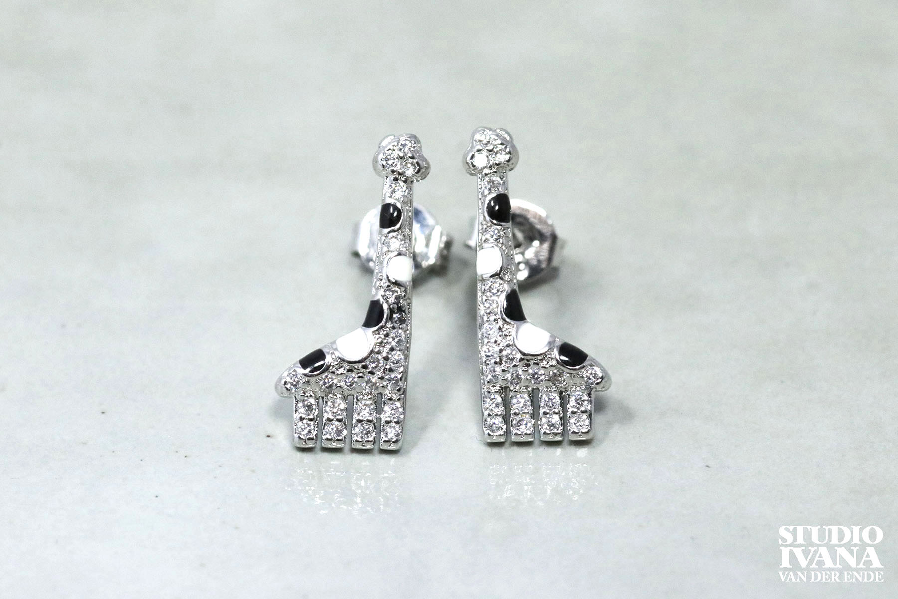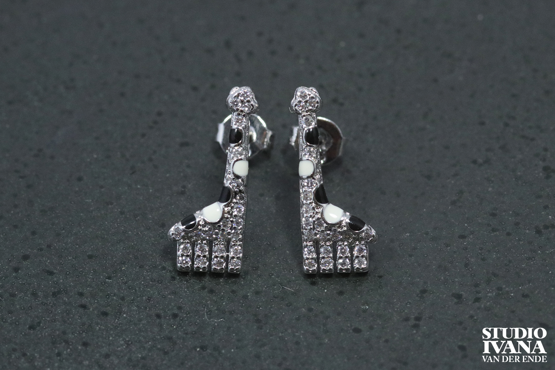 De oorbellen is versierd met zilveren, witte en zwarte steentjes.