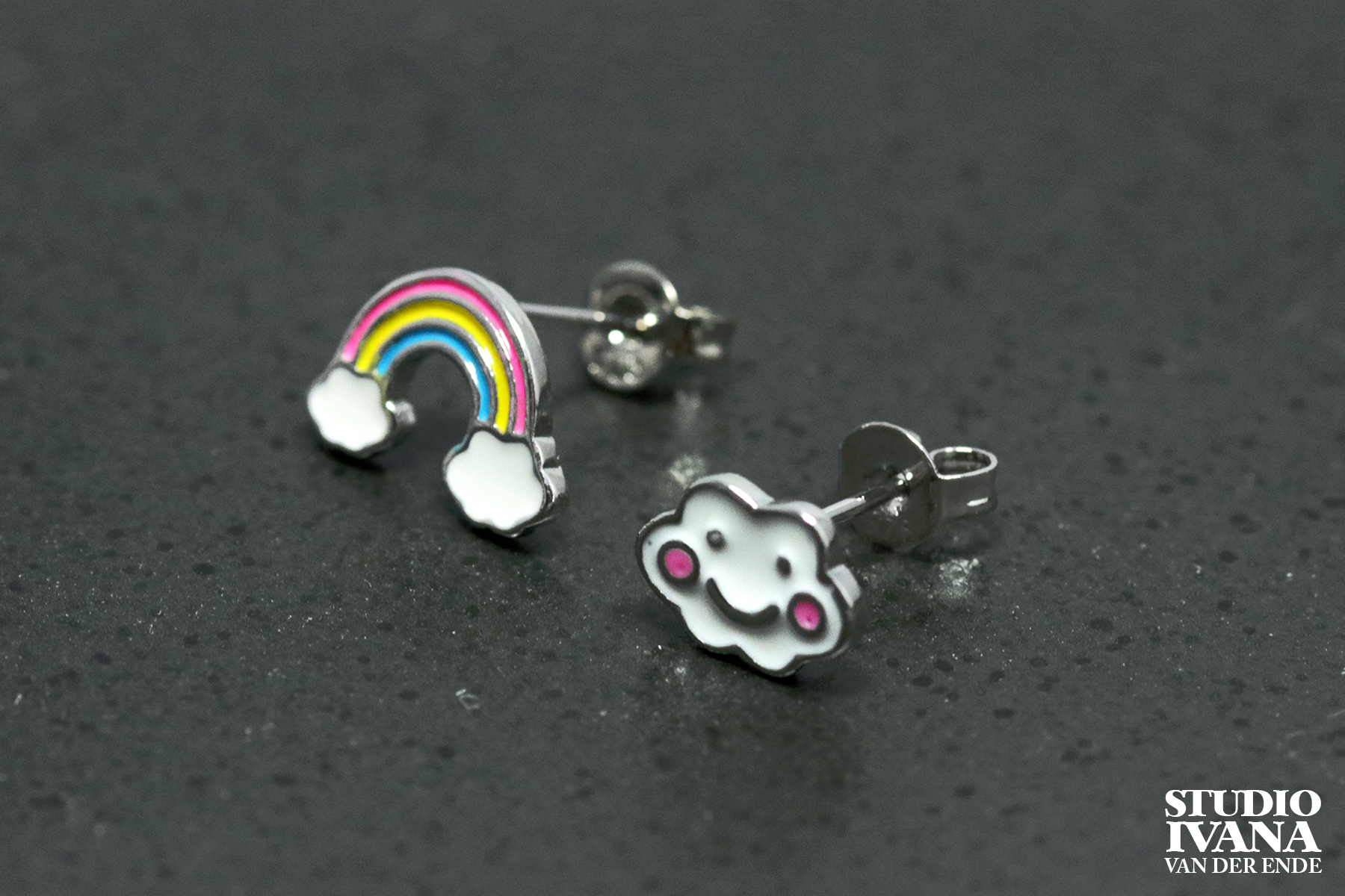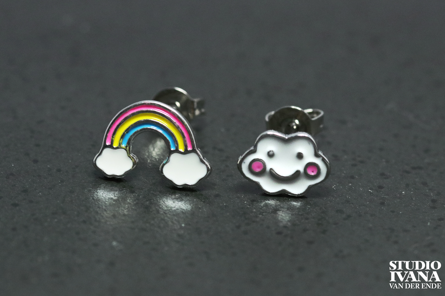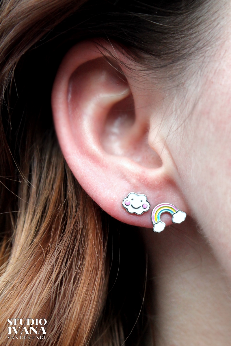 Kleurrijke oorstekers voor kinderen met een regenboog en een wolk.
