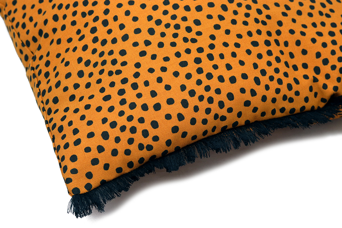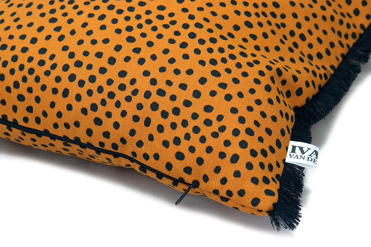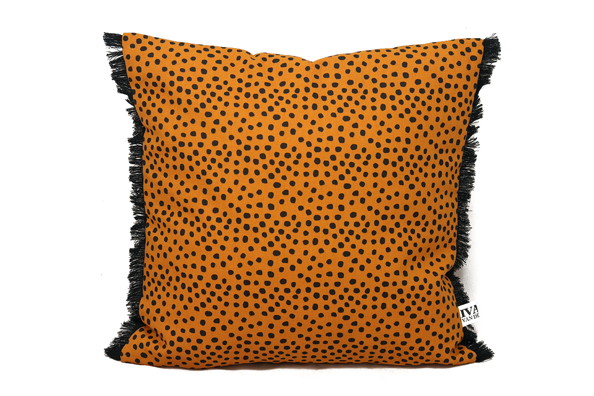 Dit katoenen, oranje kussen met zwarte stippen is handgemaakt in de STUDIO.