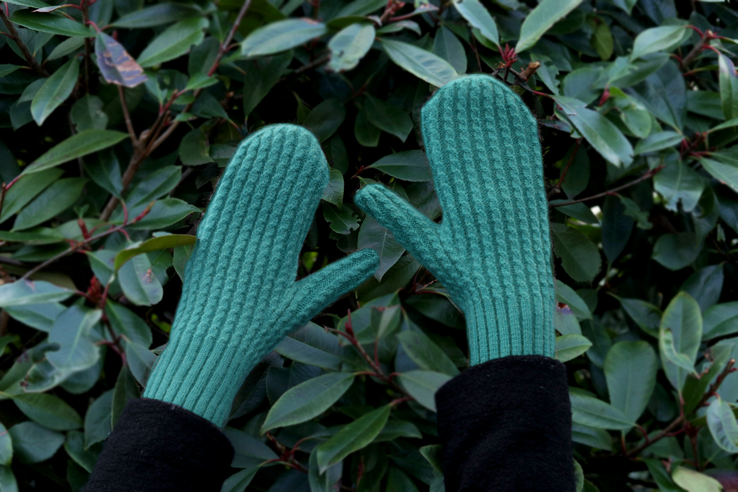 De groen/blauwe wanten hebben een minimalistische vormgeving en zijn al geschikt voor de wat frissere dagen.