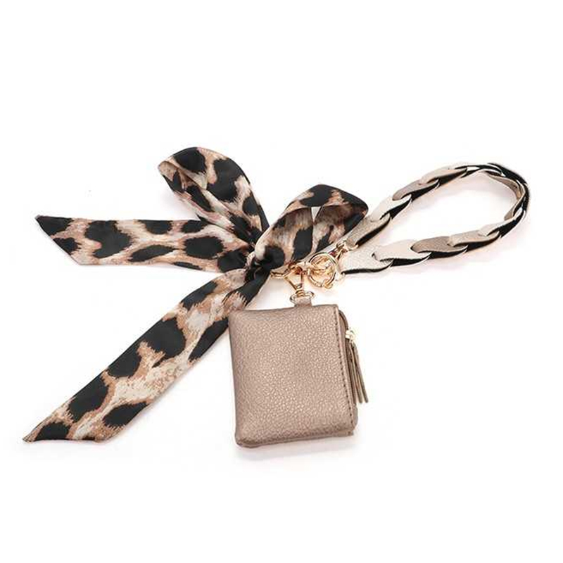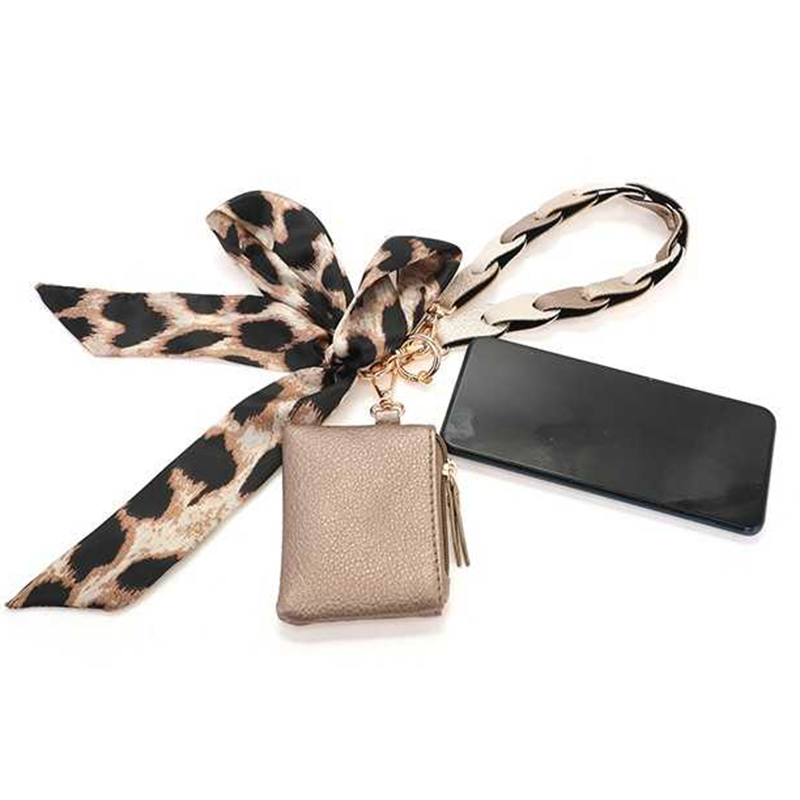 Trendy polsbandje met strik in de kleur champagne voor aan je telefoon of tas. Het polsbandje is gemaakt van gevlochten schakels van vegan leer. Aan de hanger zit een decoratieve strik en een compact portemonneetje met ritssluiting. Handig voor pasjes, sleutels of bijvoorbeeld oordopjes.