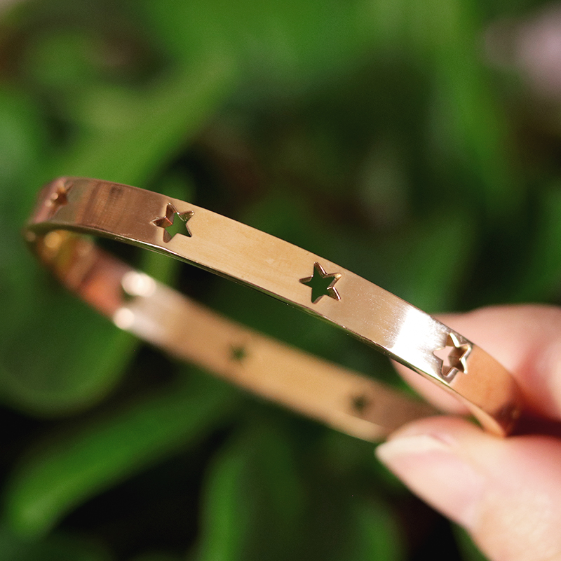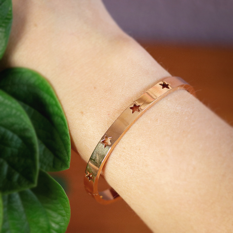 Rose armband met sterren, gemaakt van Stainless Steel. Je klikt het gemakkelijk om de pols. De grootte is niet verstelbaar.