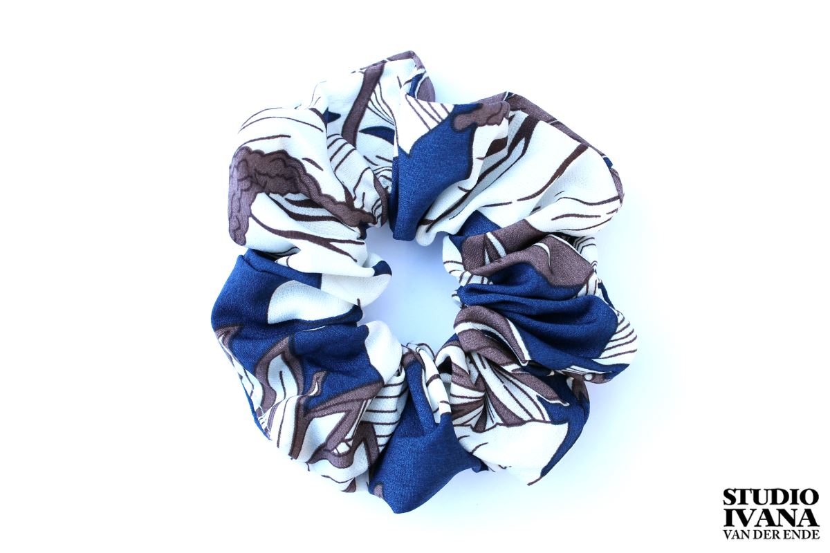 Scrunchie met speelse, botanische print in de kleuren blauw, wit, taupe.