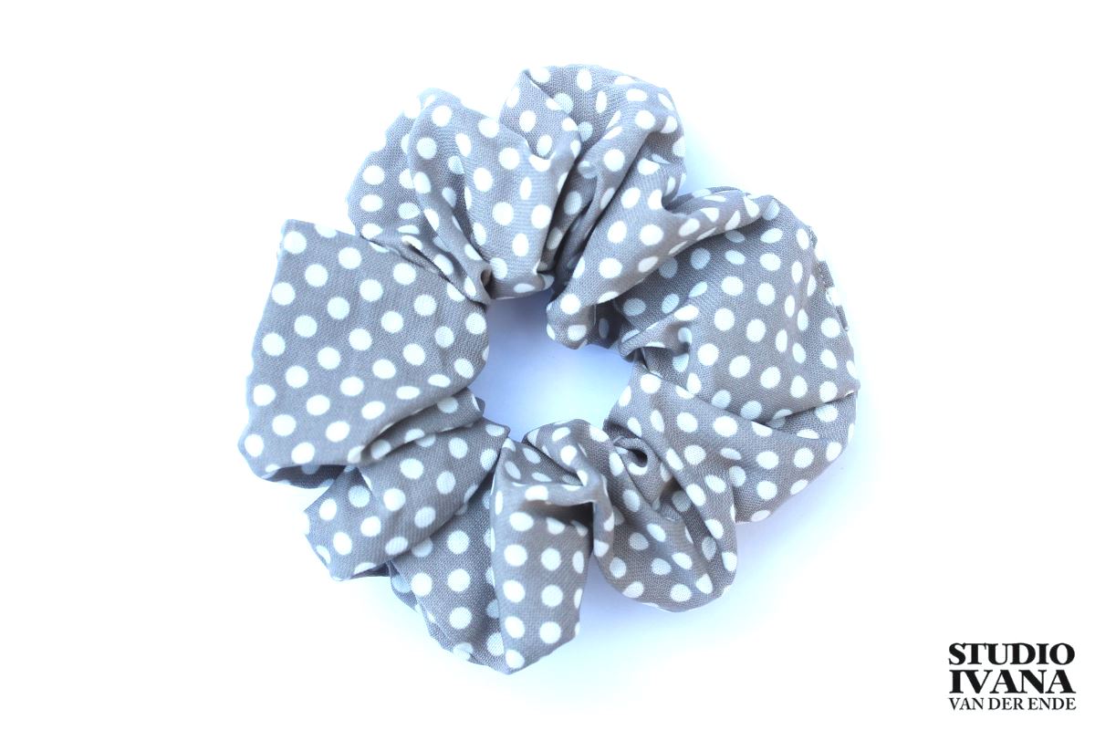 Scrunchie met stip – lichtgrijs met witte stippen.