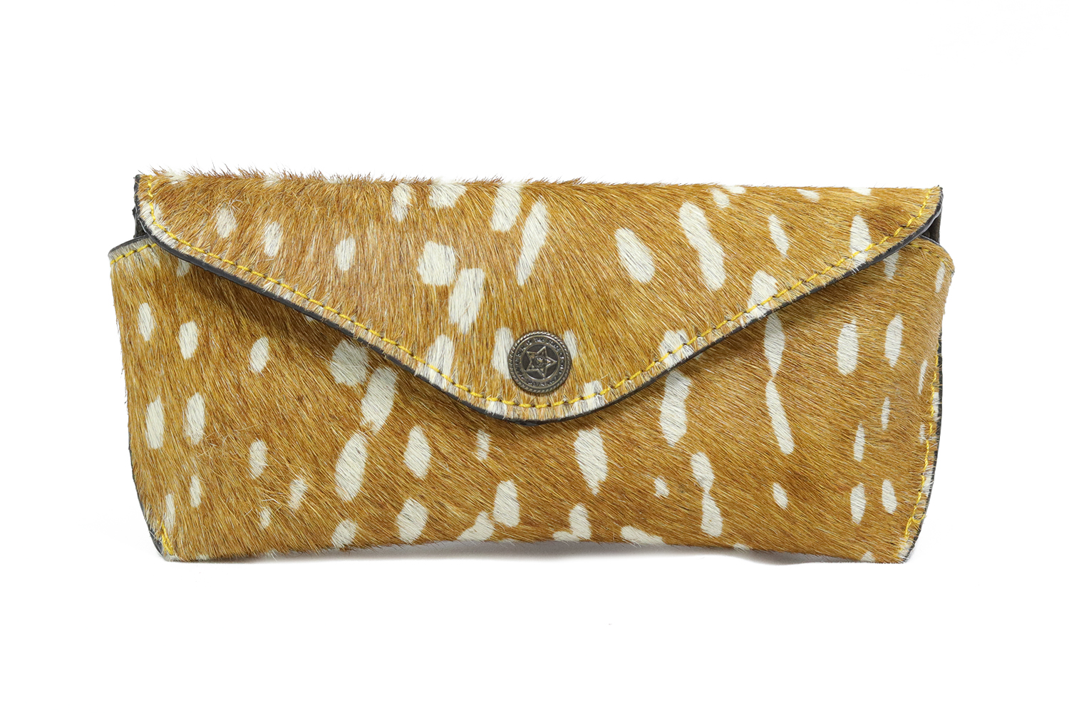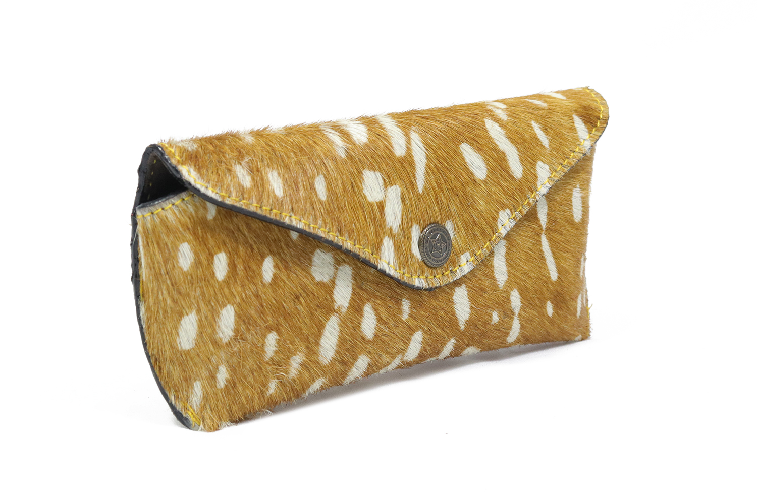 De buitenkant is voorzien van een speelse opdruk. Je sluit de brillenhoes af met de metalen drukknoop.