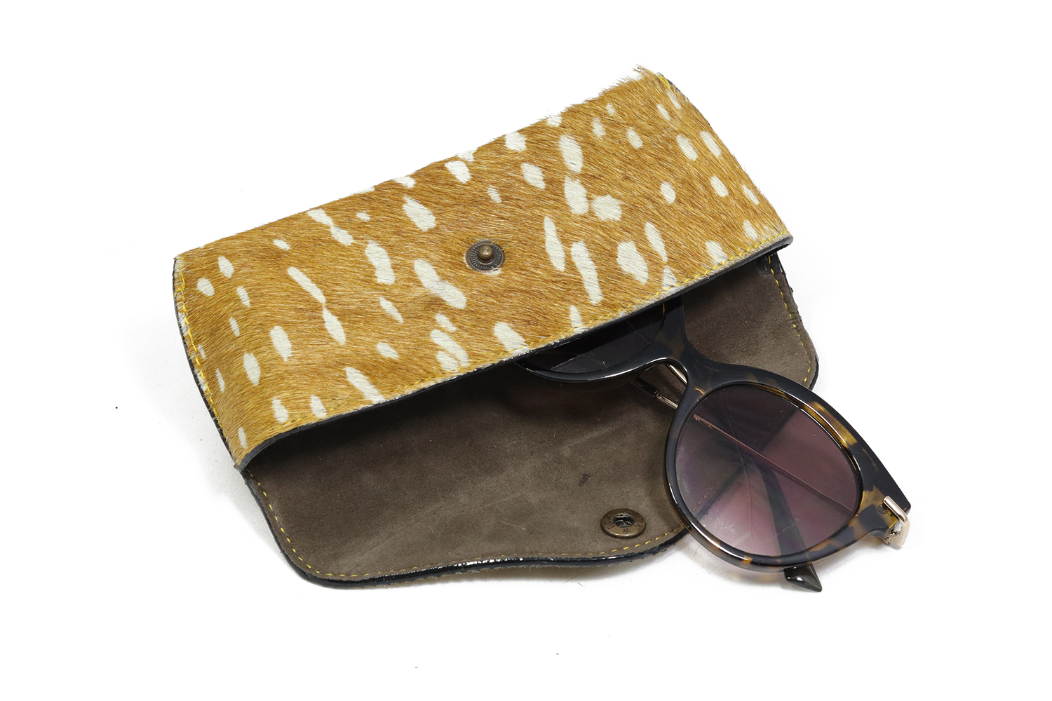 Leren brillenhoes met lichte print. Jouw (zonne)bril verdient toch een mooie verpakking?