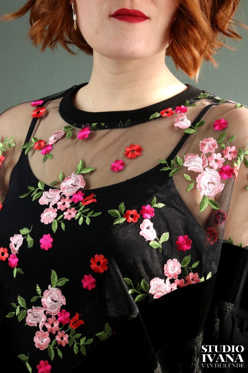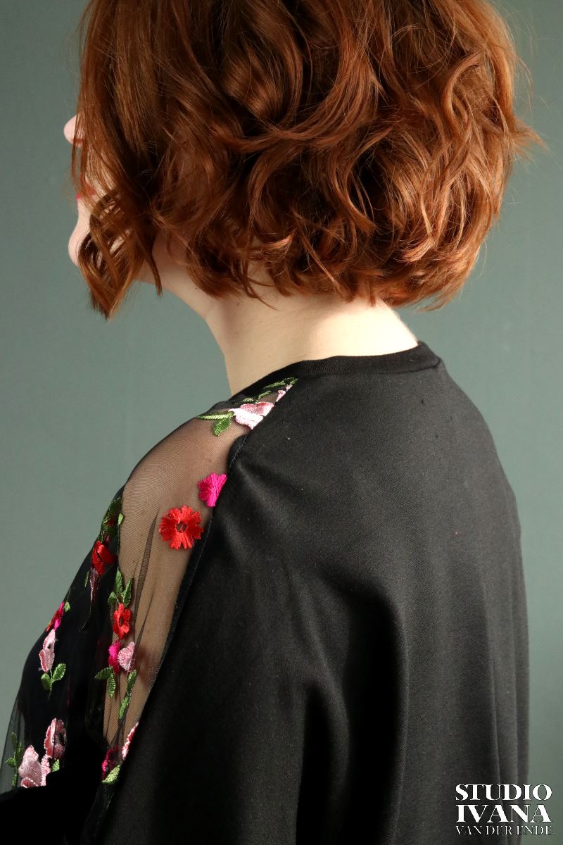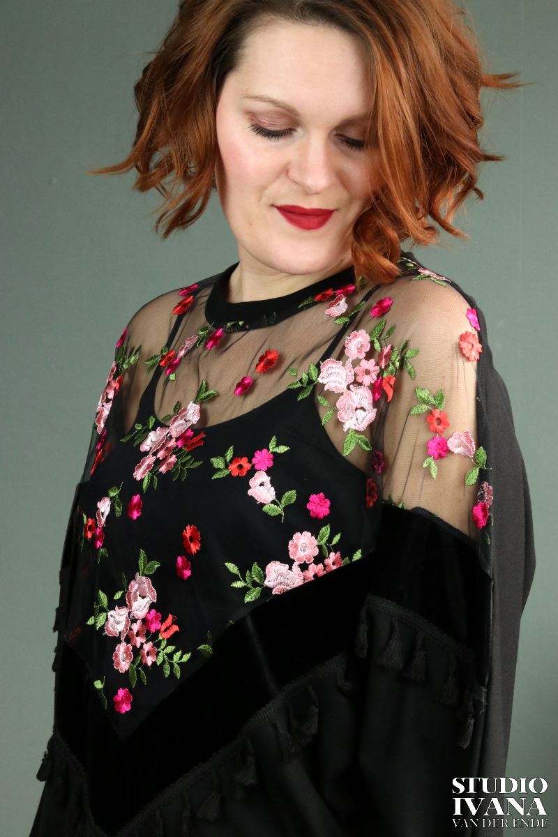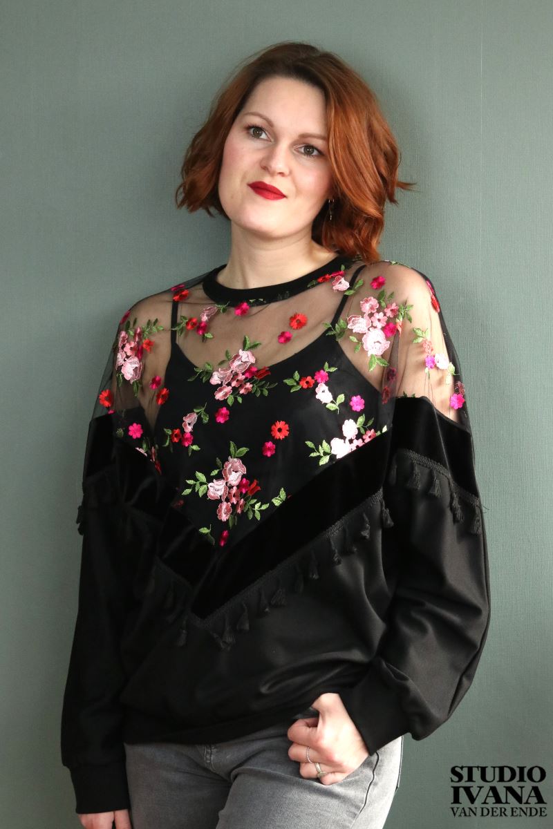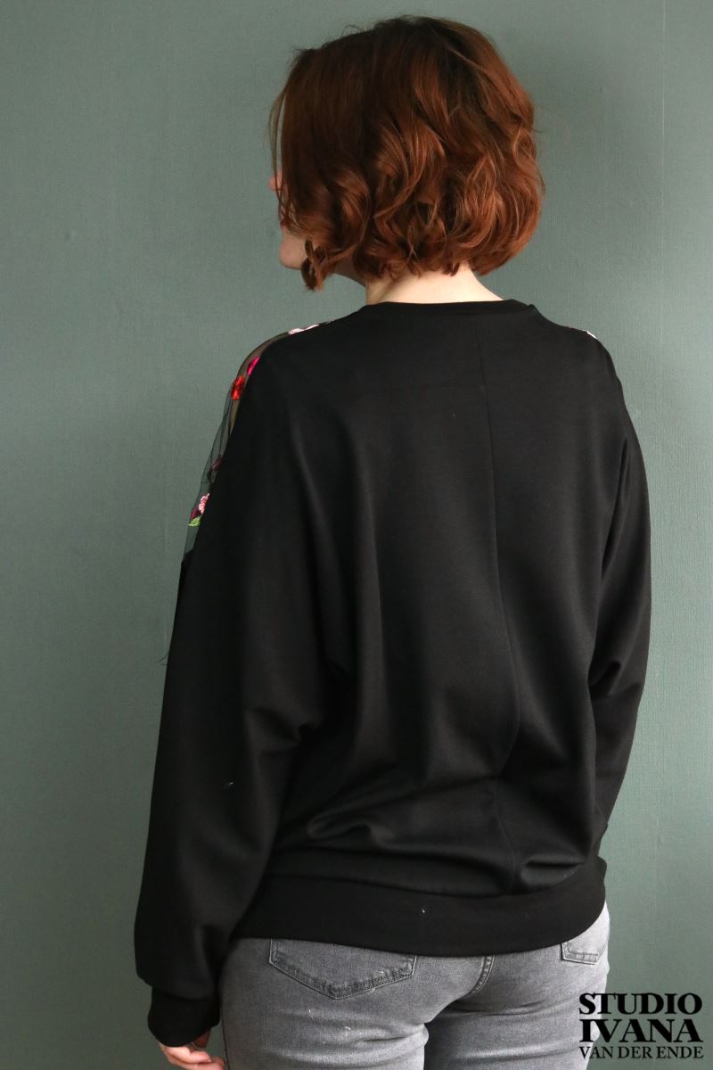 Mooie versierde sweater in het zwart met gekleurde details. Gemaakt van een zachte, zwarte tricot in combinatie met velours en mesh (kant).
