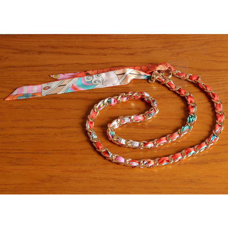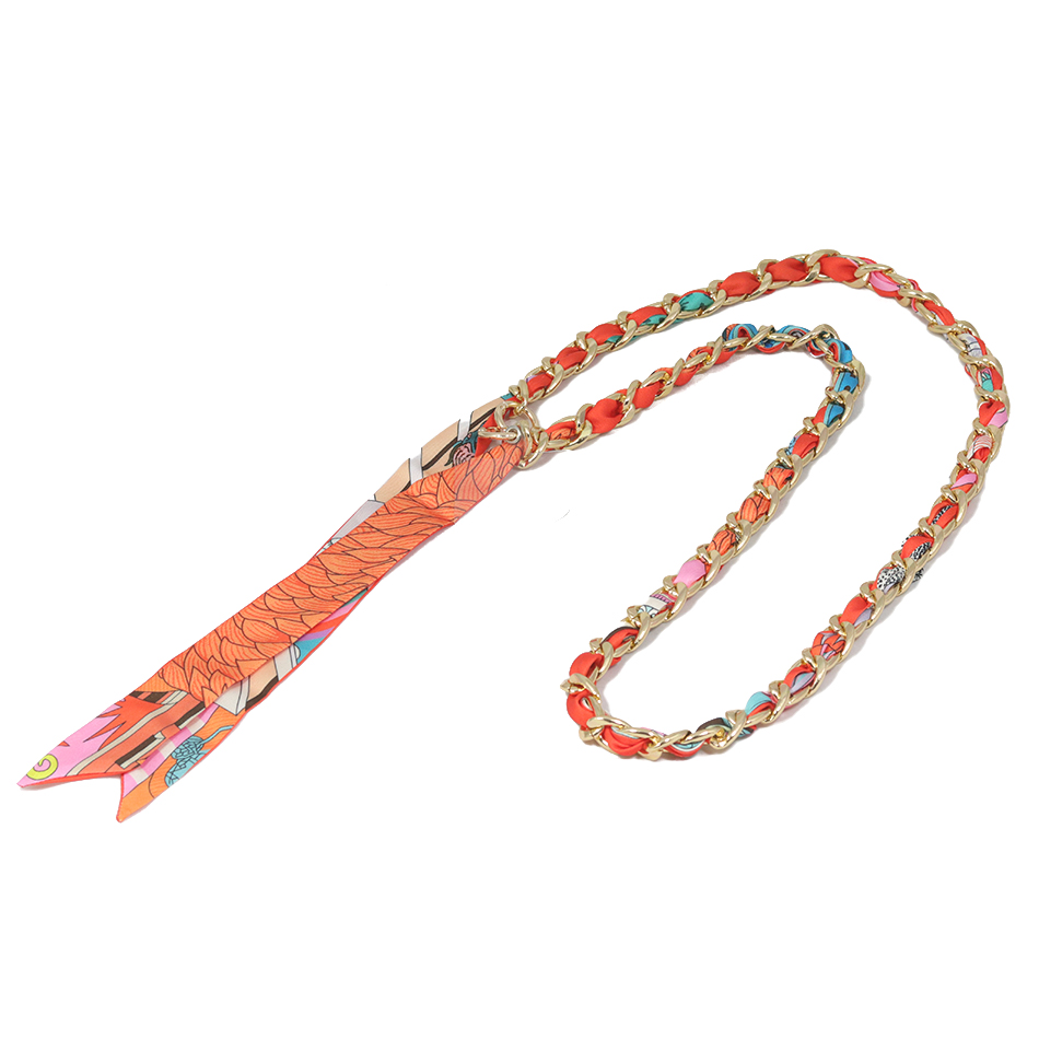 Luxe telefoonkoord Becky met gouden schakels en gevlochten satijn in de kleurencombinatie rood en oranje. De ketting met grove schakels lijken wel een sieraad voor je telefoon!