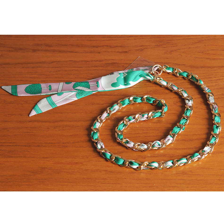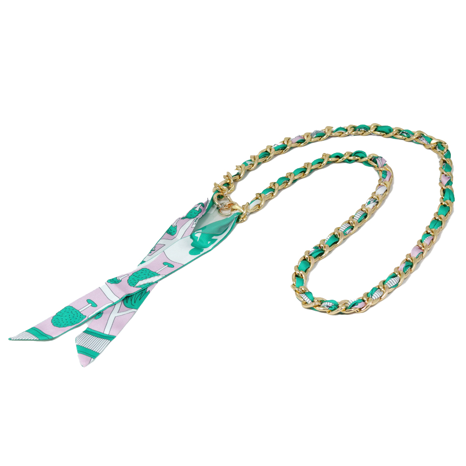 Telefoonkoord Becky met gouden schakels en gevlochten satijn in de kleurencombinatie roze en groen. De ketting met grove schakels lijken wel een sieraad voor je telefoon!