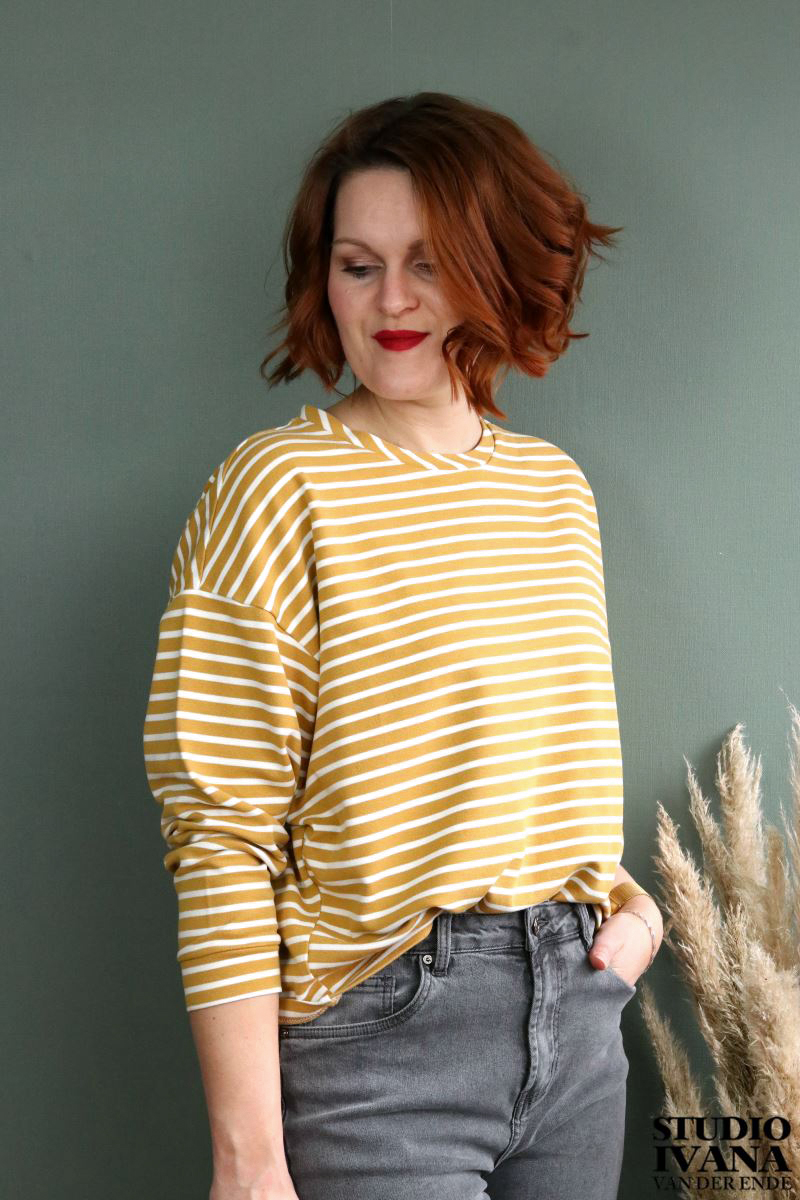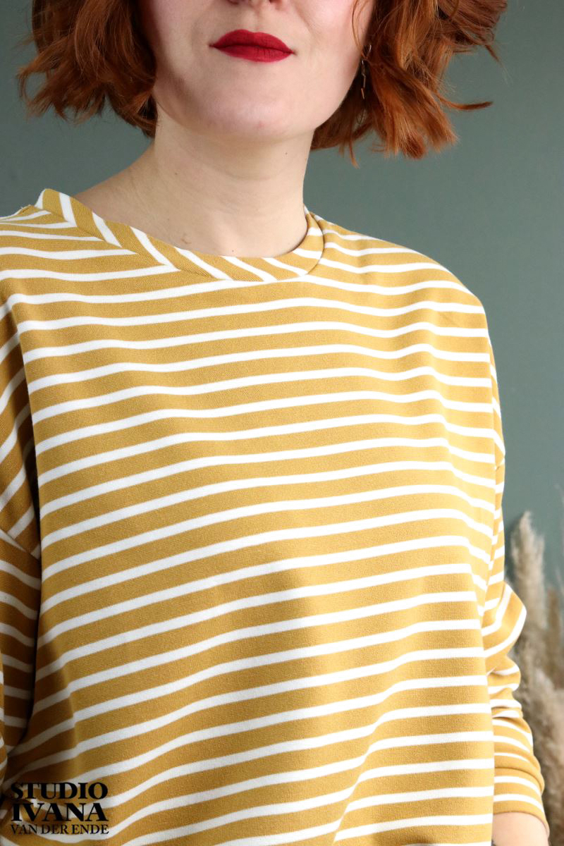 Comfortabele tricot top die wat wijder valt. Gemaakt van geel/wit gestreepte en rekbare stof.