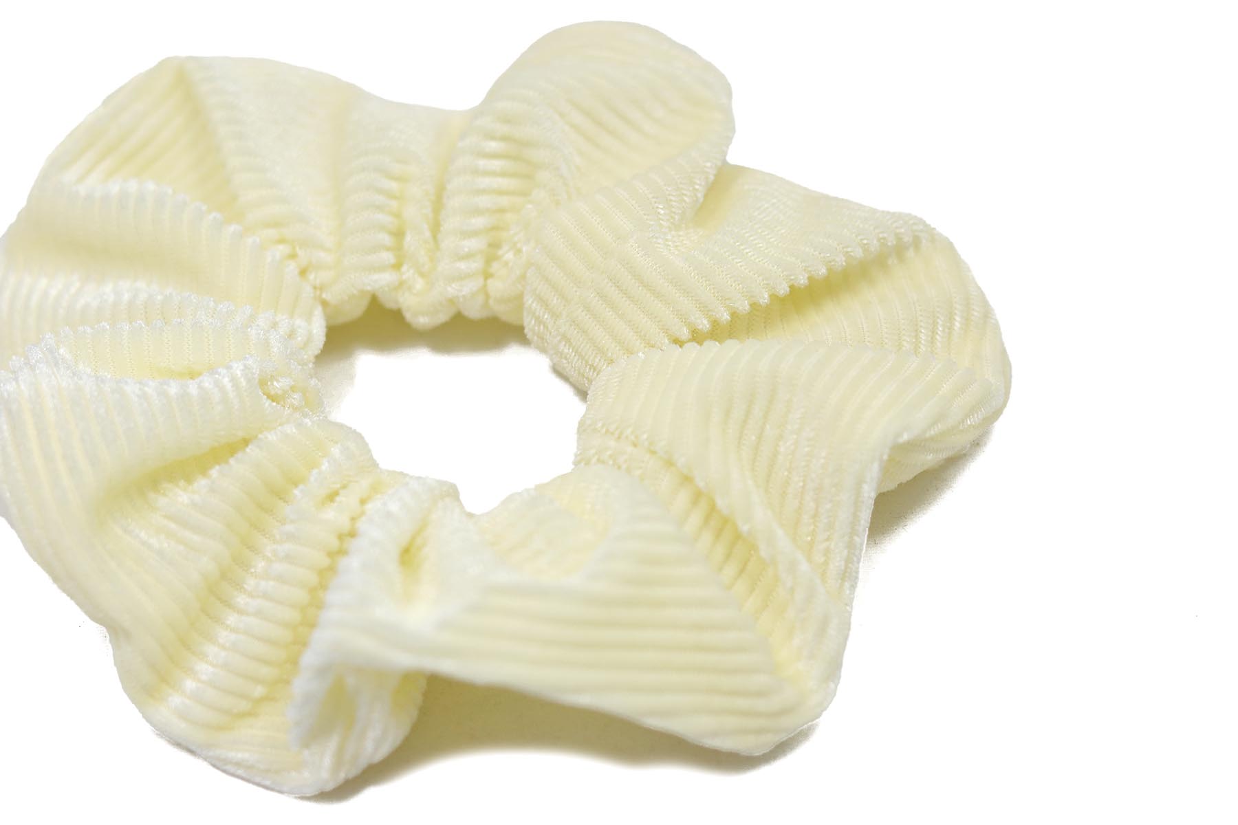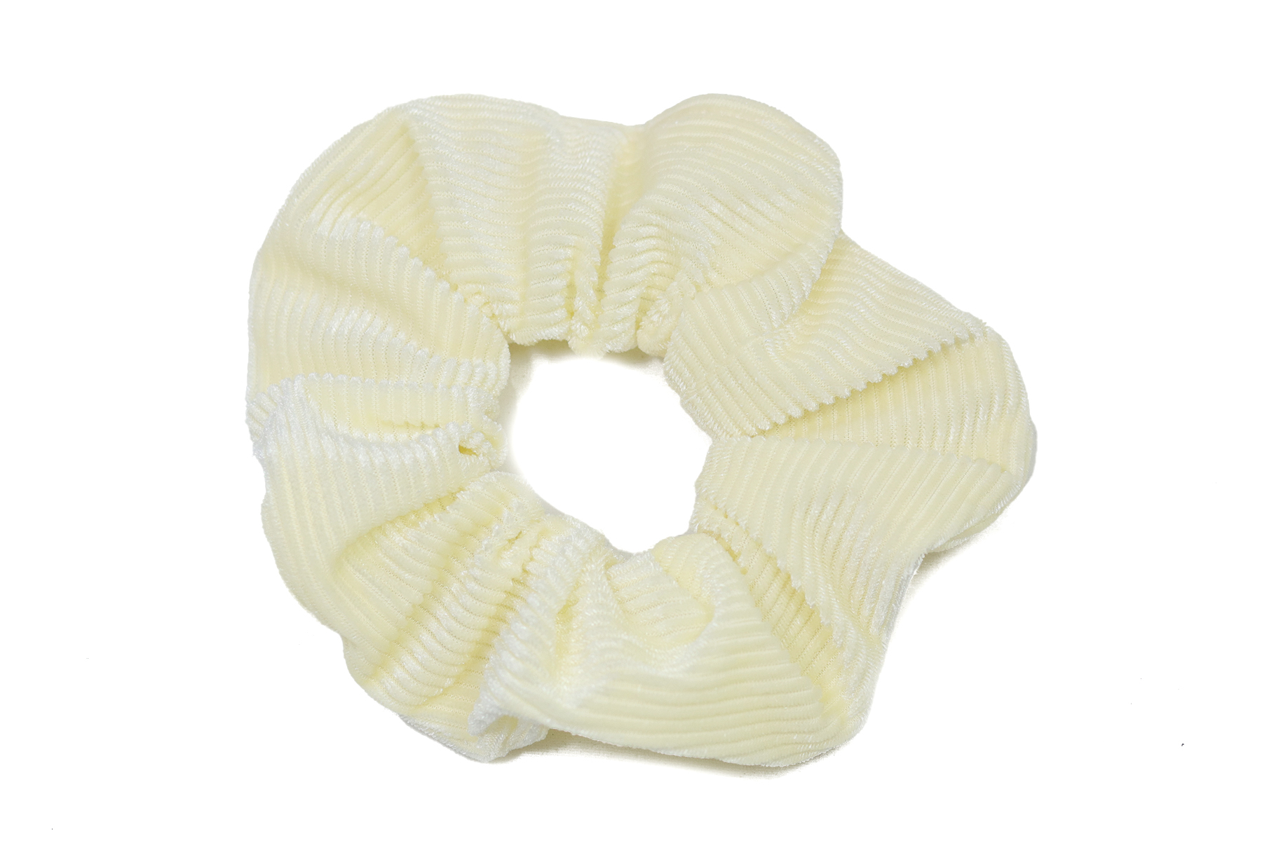 Deze vanille scrunchie van ribfluweel is verkrijgbaar in diverse kleuren. Het haarelastiek is gemaakt van een mooie, glanzende en zachte stof met kleine ribbels.
