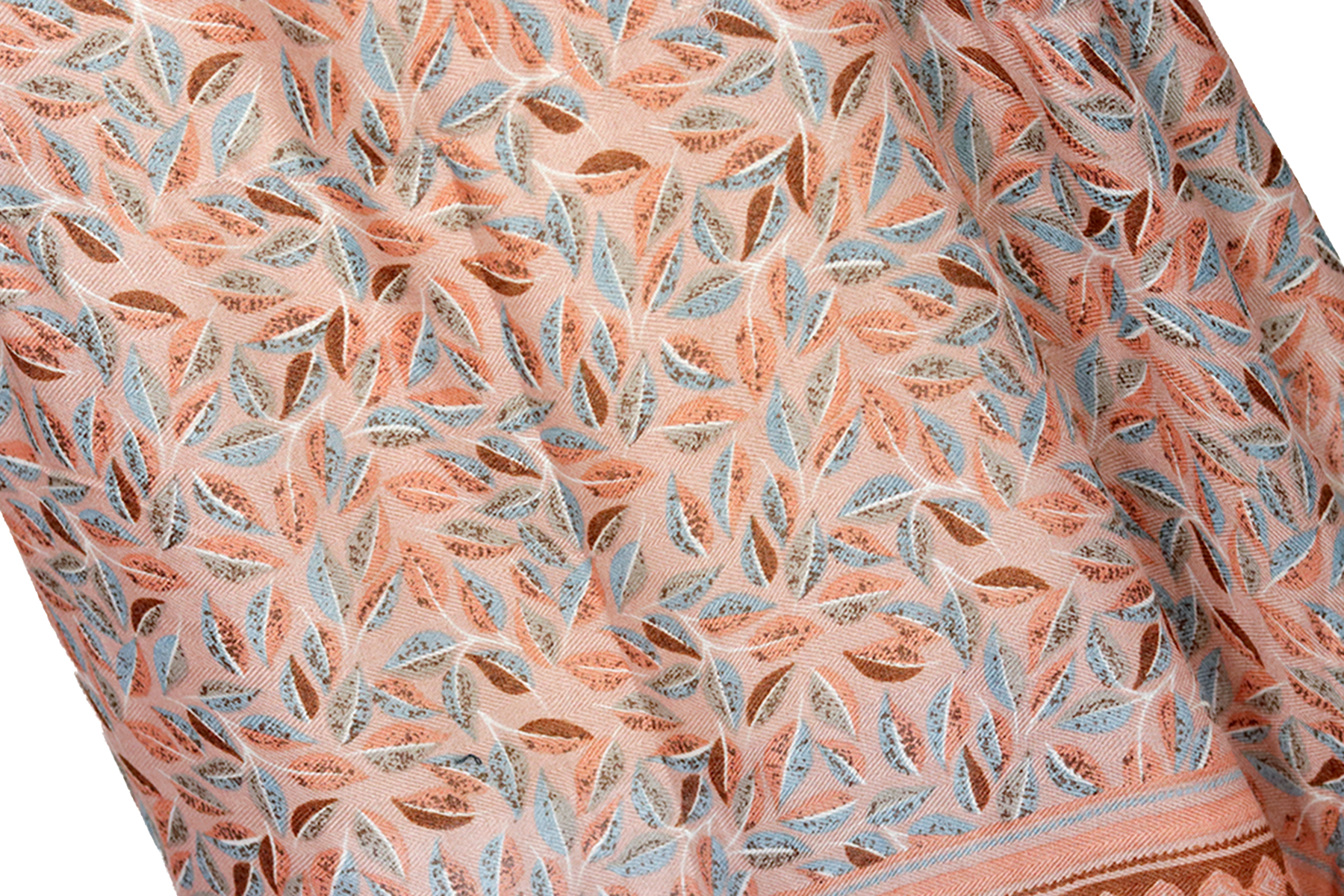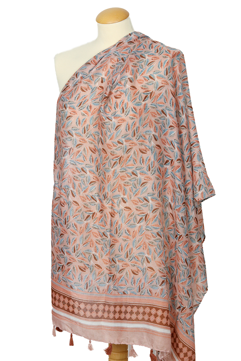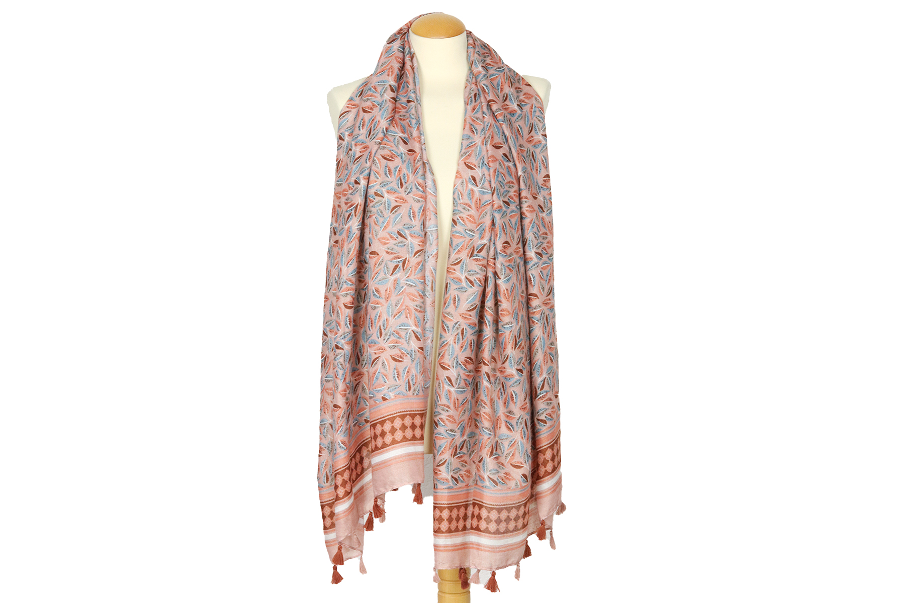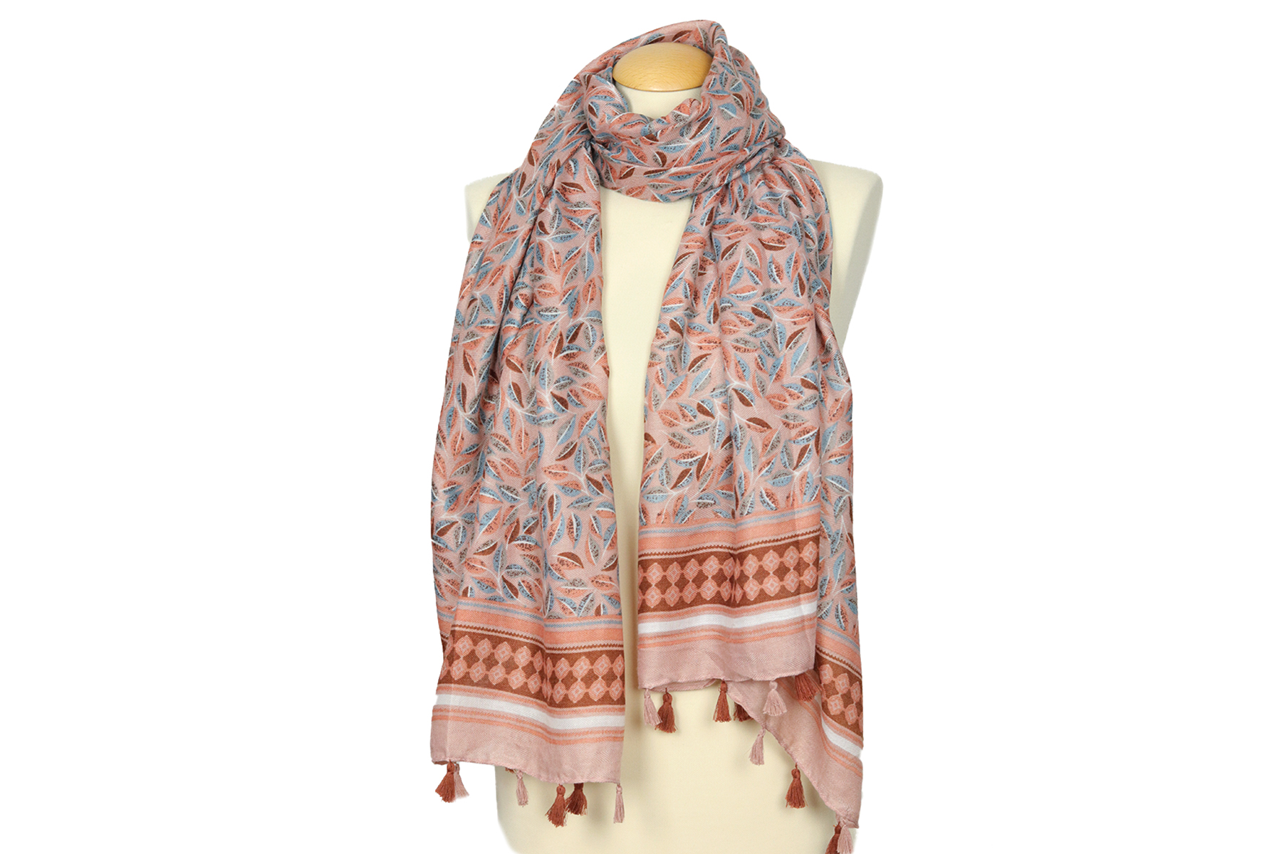 Zalm sjaal met blaadjes print en katoenen kwastjes aan de onderkant. De sjaal is lang genoeg om rondom de hals te slaan, maar je kunt het natuurlijk ook enkel om de hals dragen.