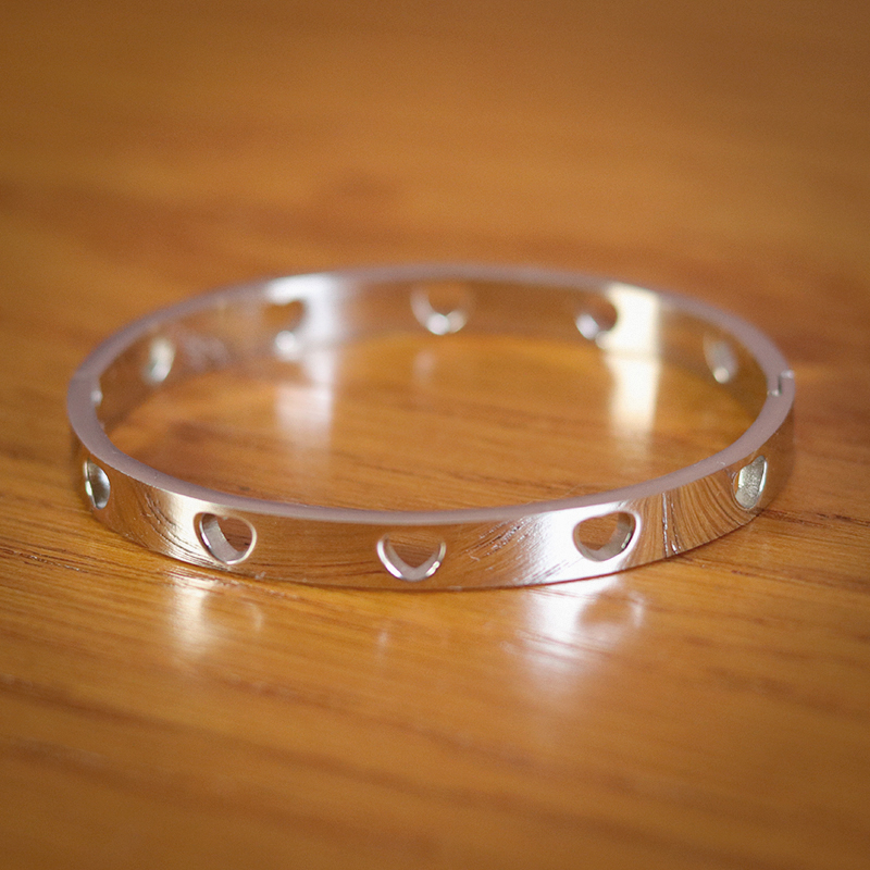 Zilveren armband met hartjes, gemaakt van Stainless Steel. Je klikt het gemakkelijk om de pols. De grootte is niet verstelbaar.