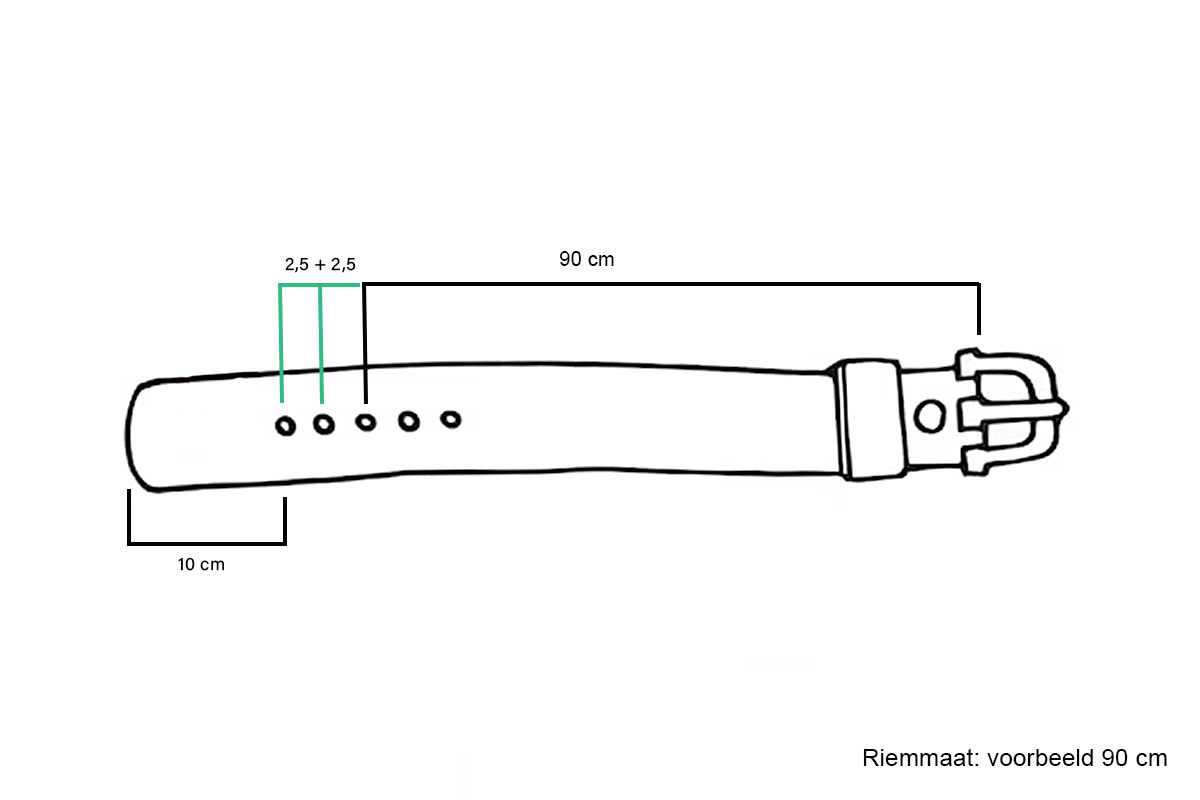 Een riem met maataanduiding 90 cm is in werkelijkheid langer. De 90 cm sluit namelijk in het middelste gaatje. Je hebt dus zowel links als rechts nog 2 gaatjes over. Een riemmaat 90 is dus geschikt voor een omvang van 90 cm + 5 cm (oftewel plus 2 extra gaatjes, op 2,5 cm afstand van elkaar). Zie de bijgevoegde afbeelding voor meer duidelijkheid.