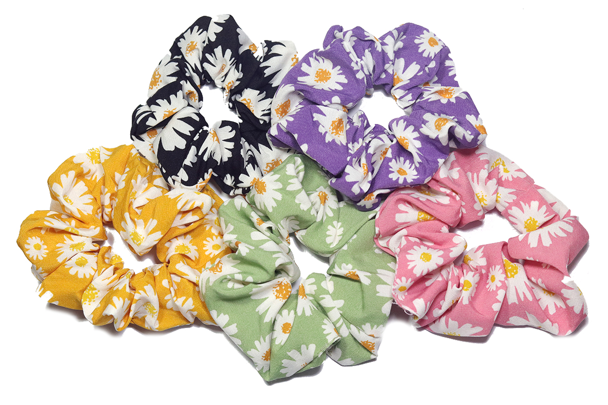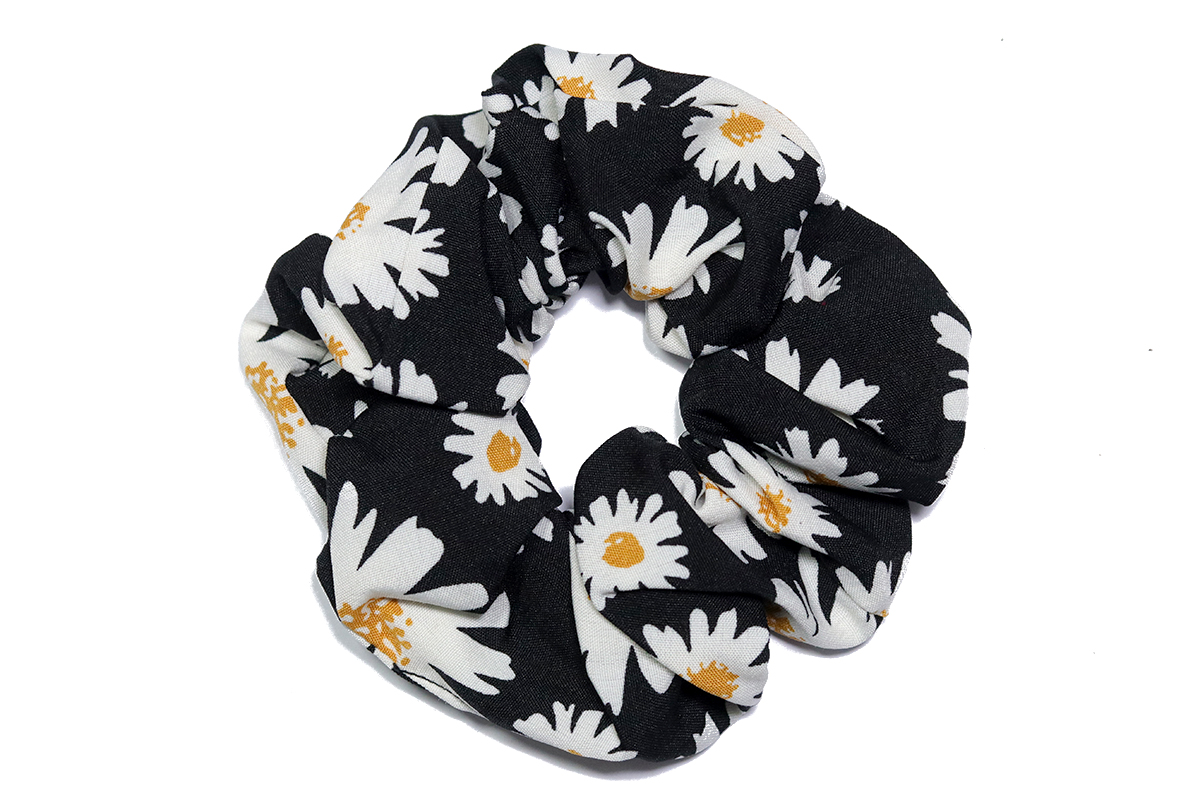 Vrolijke, zwarte scrunchie met madeliefjes print. Het haarelastiek is gemaakt van een soepele stof met motief.
